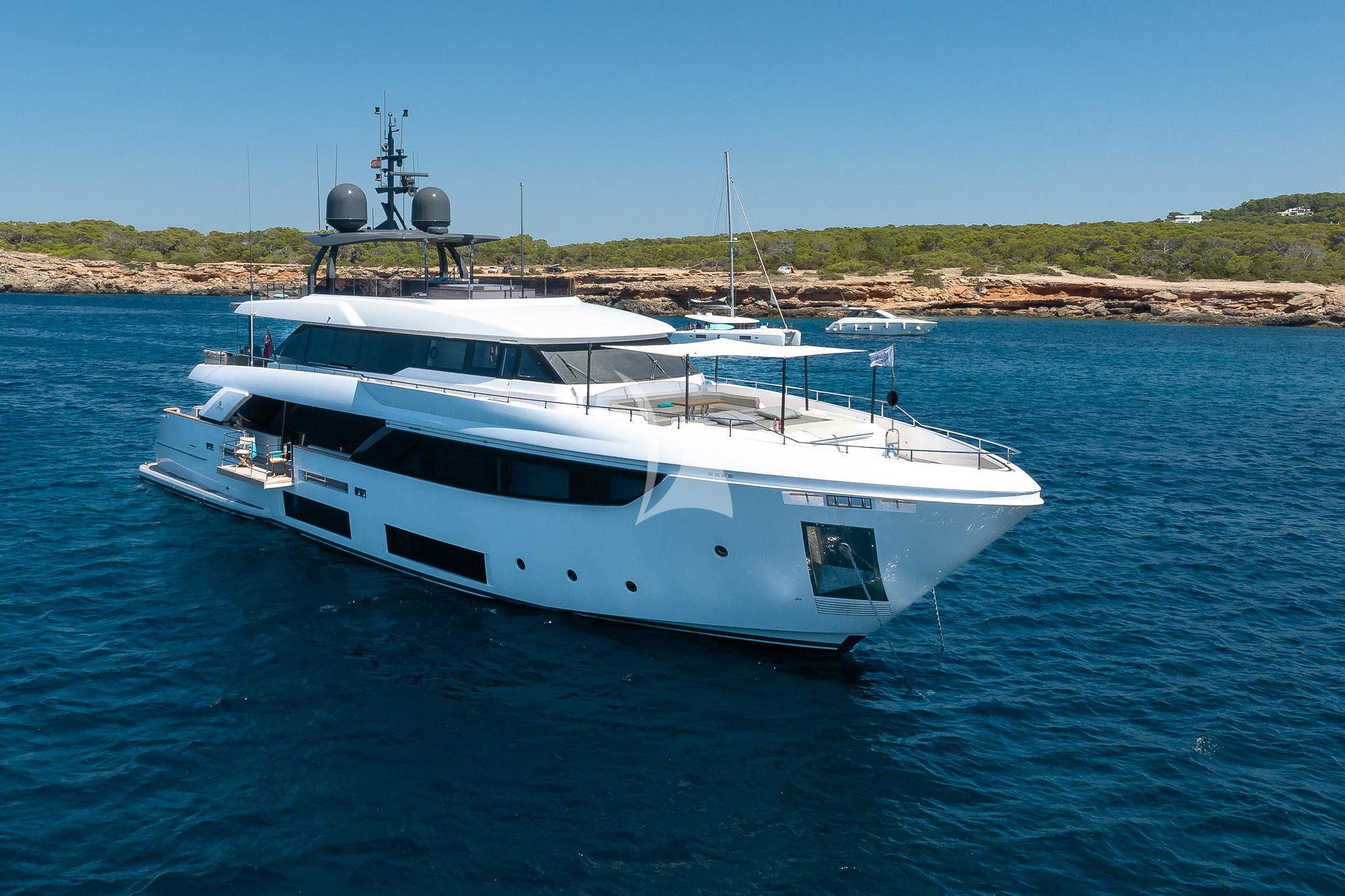 Above deck, the sundeck and foredeck provide abundant space for unwinding beneath Mediterranean skies. A jacuzzi becomes a natural gathering point, whilst plush seating and sunbeds invite extended hours of solitude or conversation. The upper aft deck transitions seamlessly into dining, where meals are served against shifting coastal backdrops as the yacht anchors near Palma or further afield.