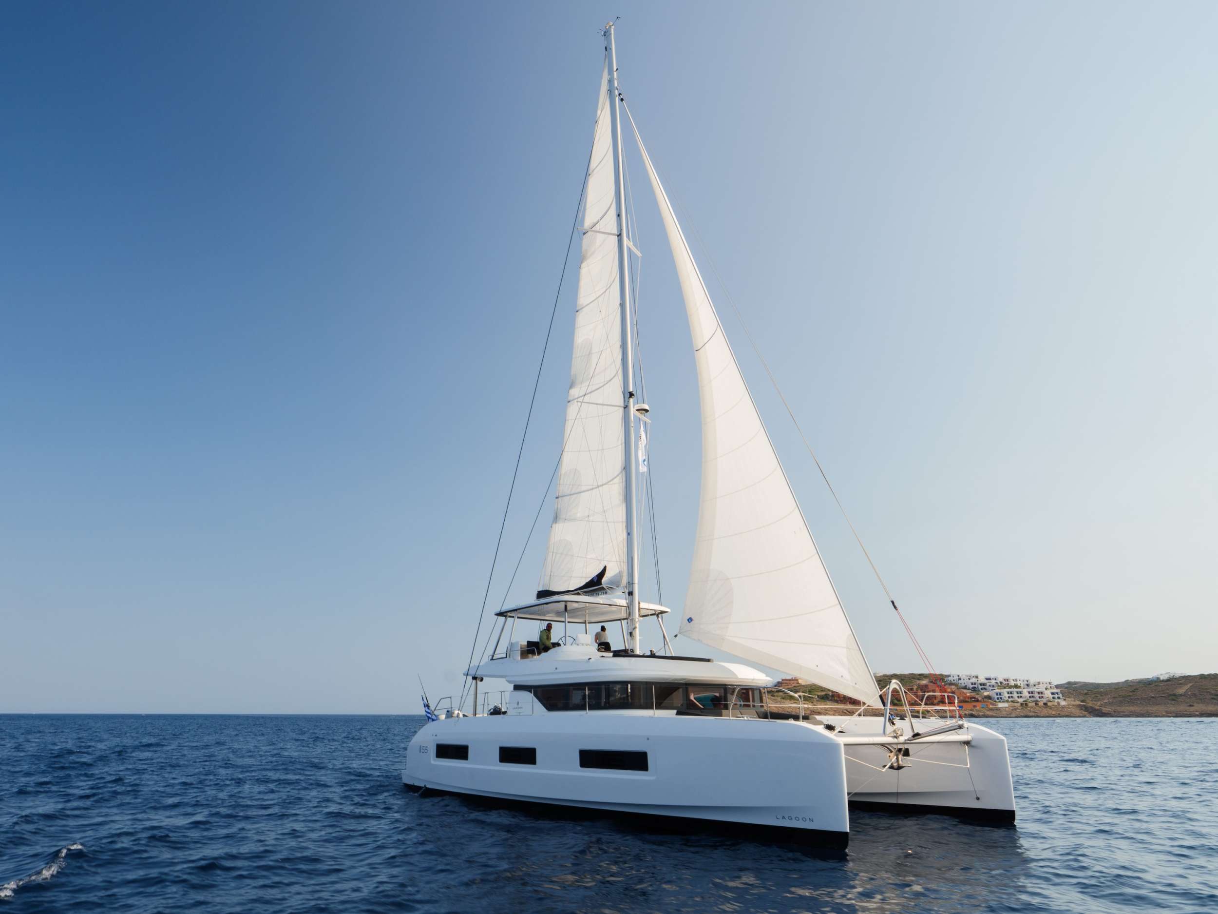 ADEL is a 2023 Lagoon 55 catamaran offering the rare combination of modern comfort and authentic Greek island discovery. Her generous beam and dual hulls create expansive deck spaces, from the foredeck trampolines perfect for morning coffee to the aft alfresco dining area where evening light lingers over Mykonos. Four double cabins accommodate eight guests with private bathrooms and teak accents, whilst the flybridge provides an elevated vantage for sunset drinks and unobstructed Aegean views.