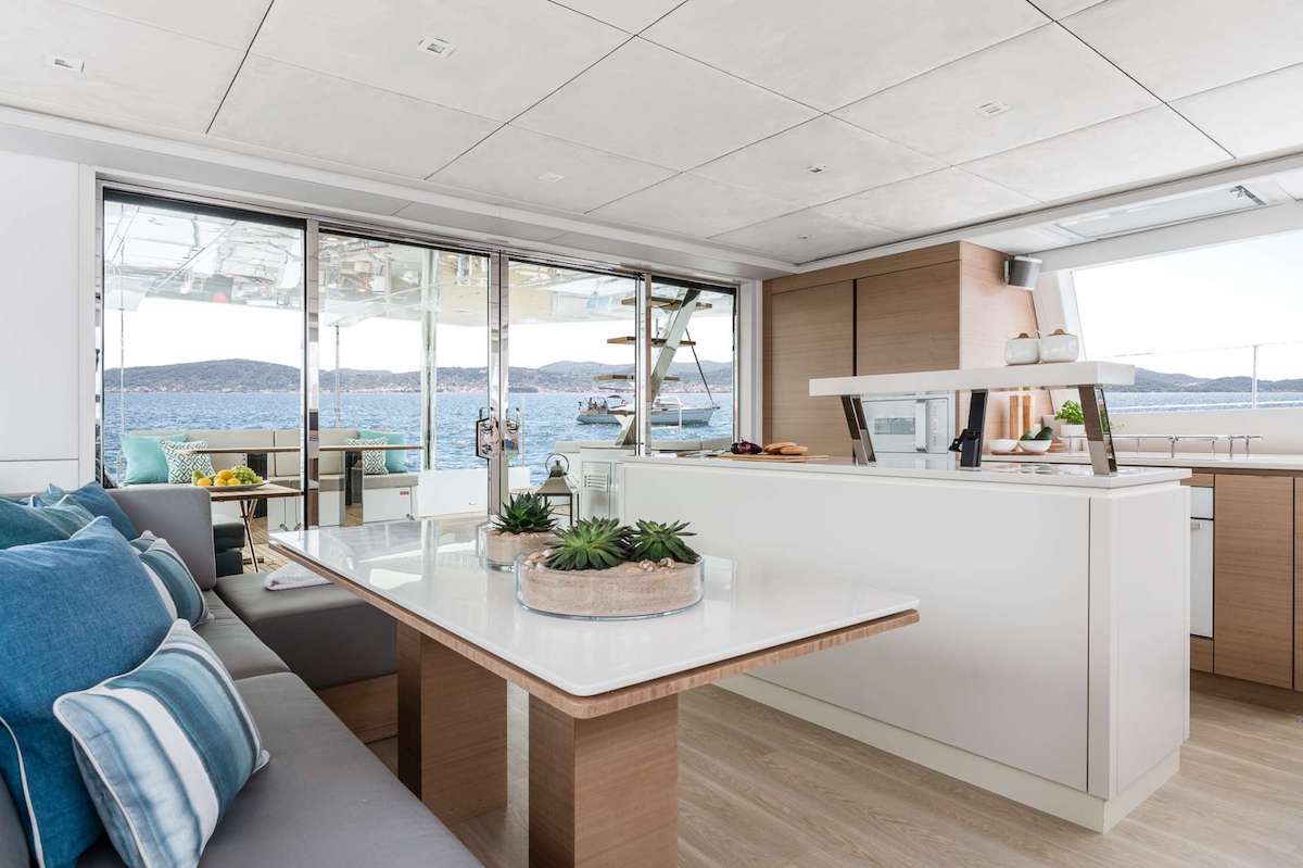 Her interior palette of eucalyptus, cream and soft blue accents establishes a contemporary marine aesthetic. The main saloon flows seamlessly to an aft cockpit via flush decking, creating a unified lounging and dining area well-suited to extended voyages. Each cabin features an ensuite bathroom with separate shower and full air-conditioning, ensuring comfort during tropical cruising.
