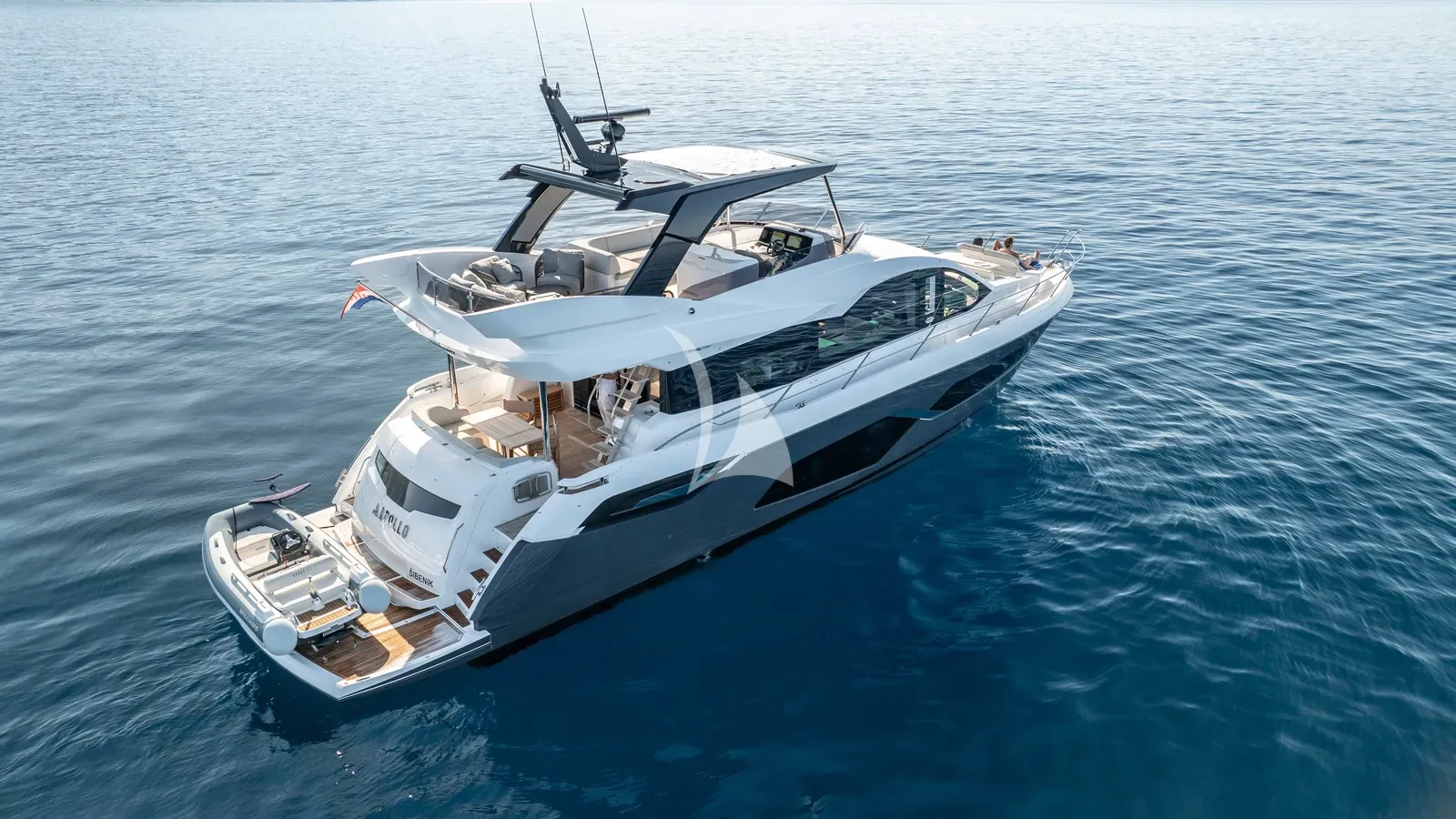 APOLLO is a 2023 Sunseeker Manhattan 68 motor yacht offering sophisticated coastal cruising for six guests across three thoughtfully appointed cabins. Her contemporary design marries performance with refinement, featuring panoramic windows that flood interiors with natural light and a commanding flybridge ideal for evening entertaining or morning aperitifs overlooking the Dalmatian coast.
