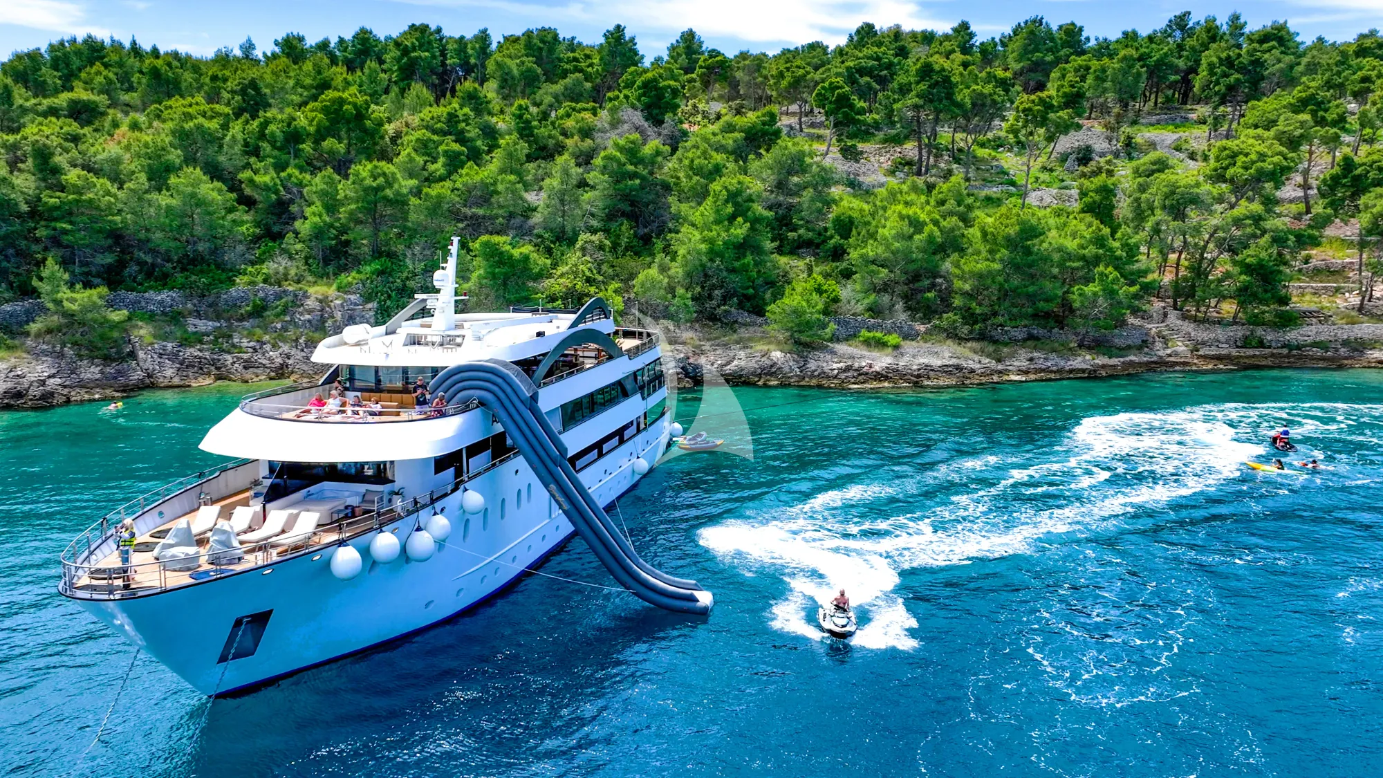 - •Expansive sun deck with multiple lounging zones, jacuzzis, and alfresco dining area overlooking the Adriatic