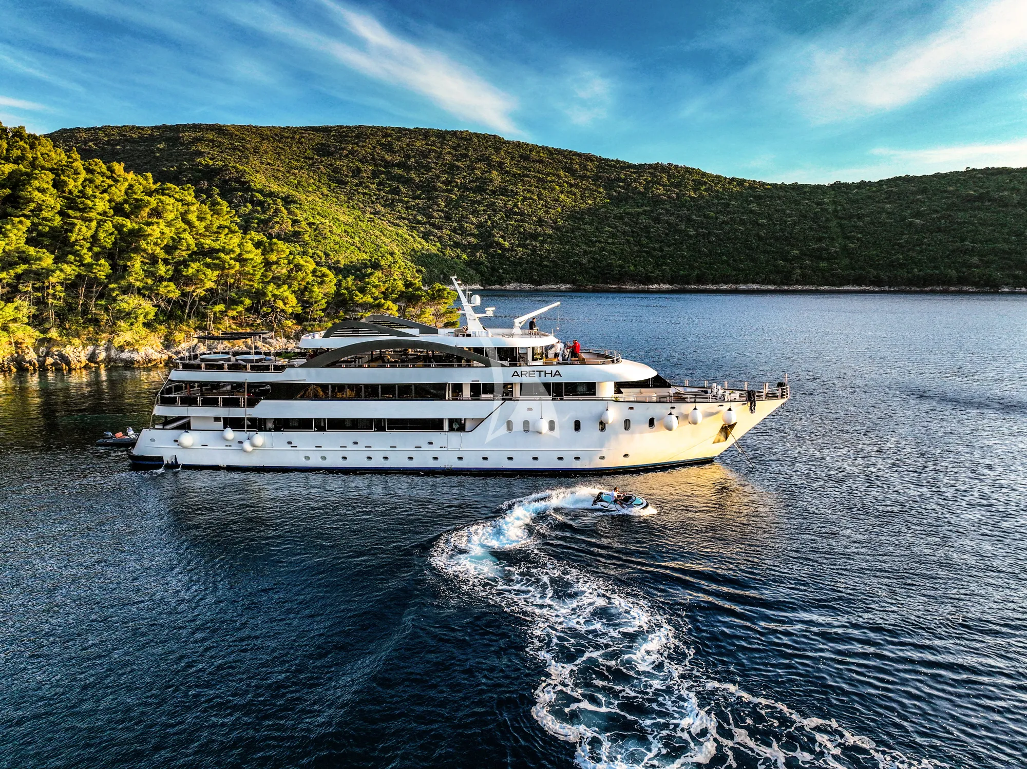 ARETHA is a custom-built motor yacht offering refined accommodation across 15 cabins, designed to charter the Adriatic with complete ease and sophistication. Built in 2018, she combines contemporary styling with purposeful naval architecture, promising effortless cruising from Split southward along the Croatian coast.