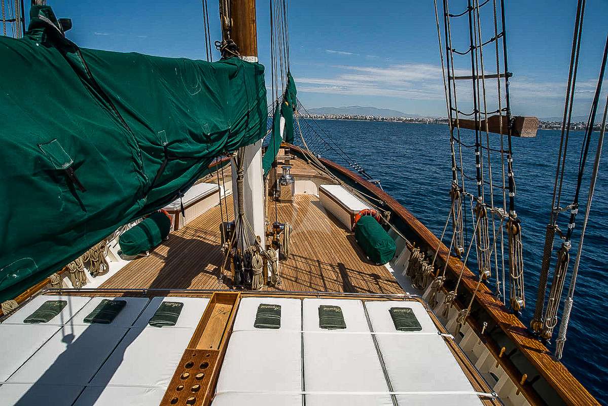 The interior centres on a bright saloon flooded with natural light through expansive glazing, ideal for evening gatherings or dining. The galley produces refined Mediterranean cuisine using local ingredients, whilst the upper deck features a generous alfresco dining area and dedicated sunbathing space. A foredeck retreat offers panoramic vistas, perfect for quiet moments with views across Athens or the Aegean.