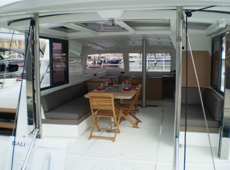 The interior opens entirely to the aft deck via retracting glass panels, creating a seamless transition between cabin and sea. Evening gatherings flow naturally from dining below to starlit aperitifs on deck, whilst the twin hulls provide the stability and space that distinguishes a catamaran from traditional monohull yachts.