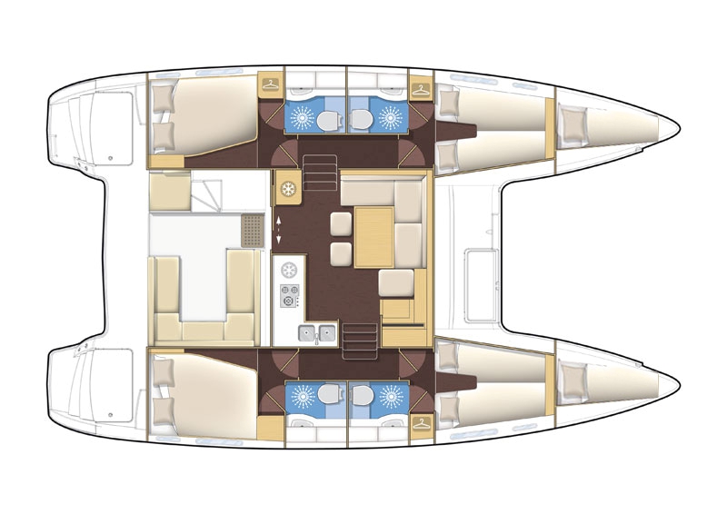 Six cabins and four heads ensure guests maintain privacy and comfort throughout extended charters. The layout separates owner's quarters from guest accommodation, a consideration absent from many production catamarans of this class. Full battened main sail and furling genoa facilitate easy handling, whilst integrated heating extends the cruising season beyond summer months.