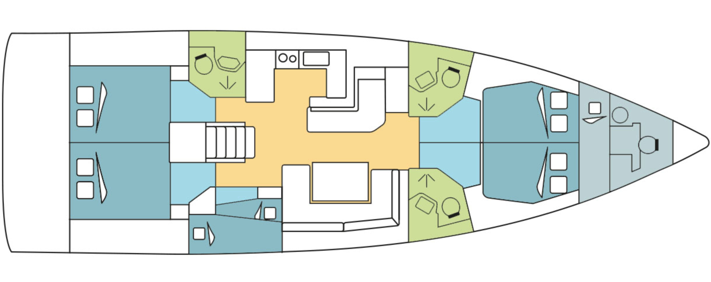 Below deck, the accommodation centres on a horseshoe galley positioned to keep crew engaged with the main salon rather than isolated. Six cabins (five doubles plus one single) provide flexible sleeping arrangements, with three heads serving the quarters. Air conditioning throughout maintains comfort during warmer Mediterranean passages, whilst the convertible salon table adapts to dining and chart work as needed.