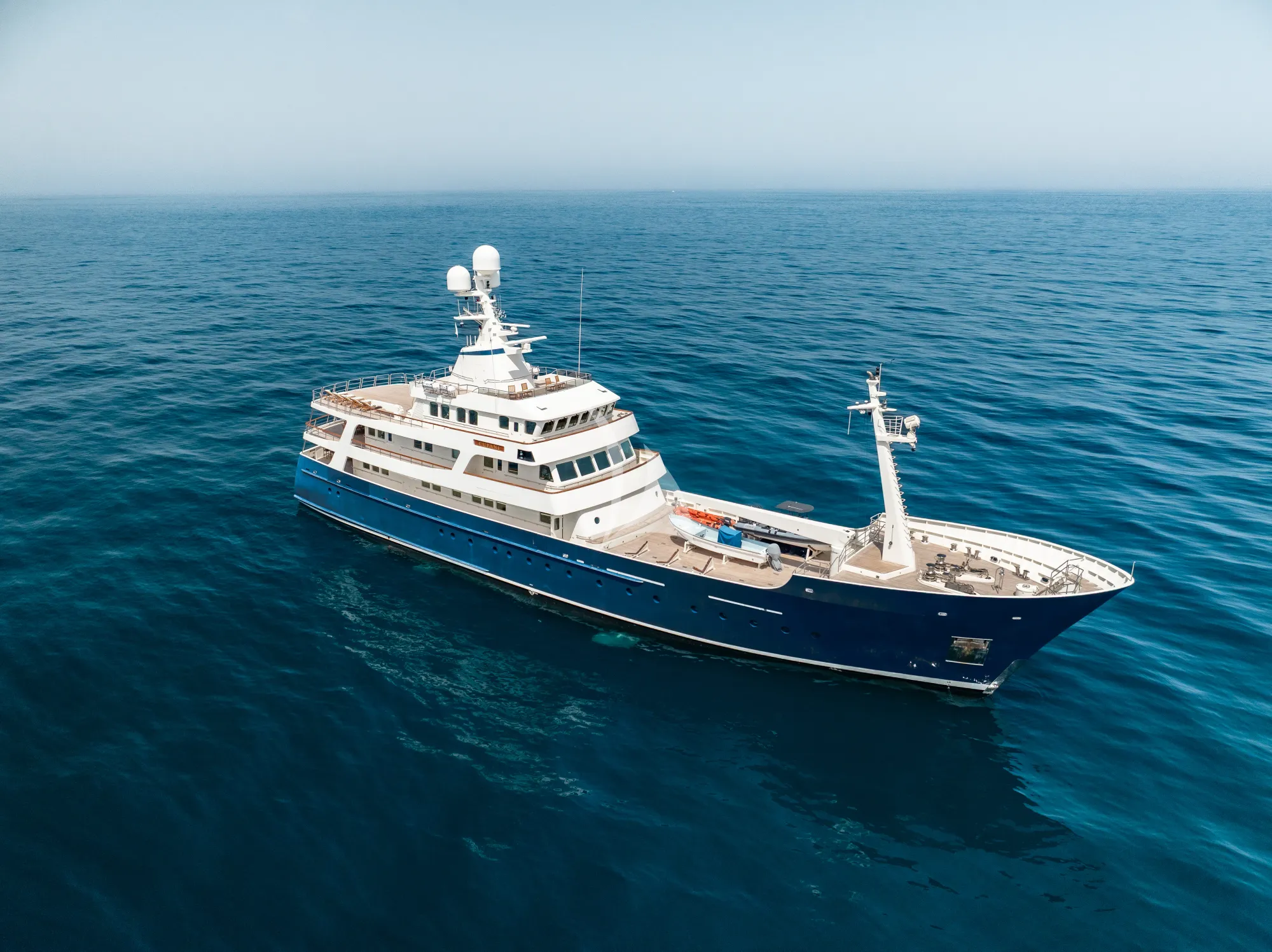 CUPANI is a Royal Denship motor yacht built with the refined proportions and purposeful design that define the marque. Her contemporary interior features warm teak accents, generous windows throughout the main saloon, and an intimate library that captures natural light. Eight cabins accommodate twelve guests in measured comfort, each with private facilities. The master suite commands the forward accommodation with dual bathrooms and a soaking tub.