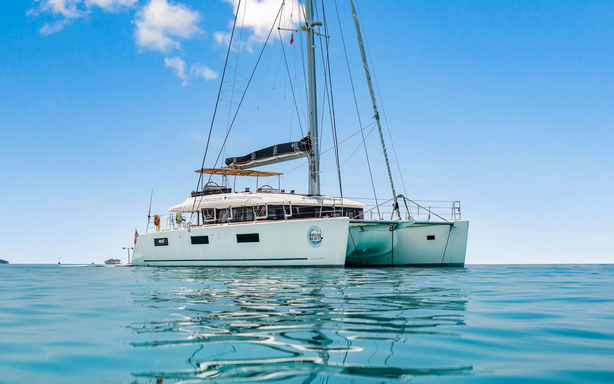 DREAM BEAUTY is a 2019 Lagoon 620 crewed catamaran offering five queen cabins for up to ten guests. Her contemporary interior pairs warm teak finishes with an open-plan saloon and fully equipped galley, whilst the expansive deck layout provides multiple social spaces. The foredeck sunpad commands views across turquoise waters, the aft deck accommodates intimate suppers, and the flybridge serves as a vantage point for observing the archipelago's geography.