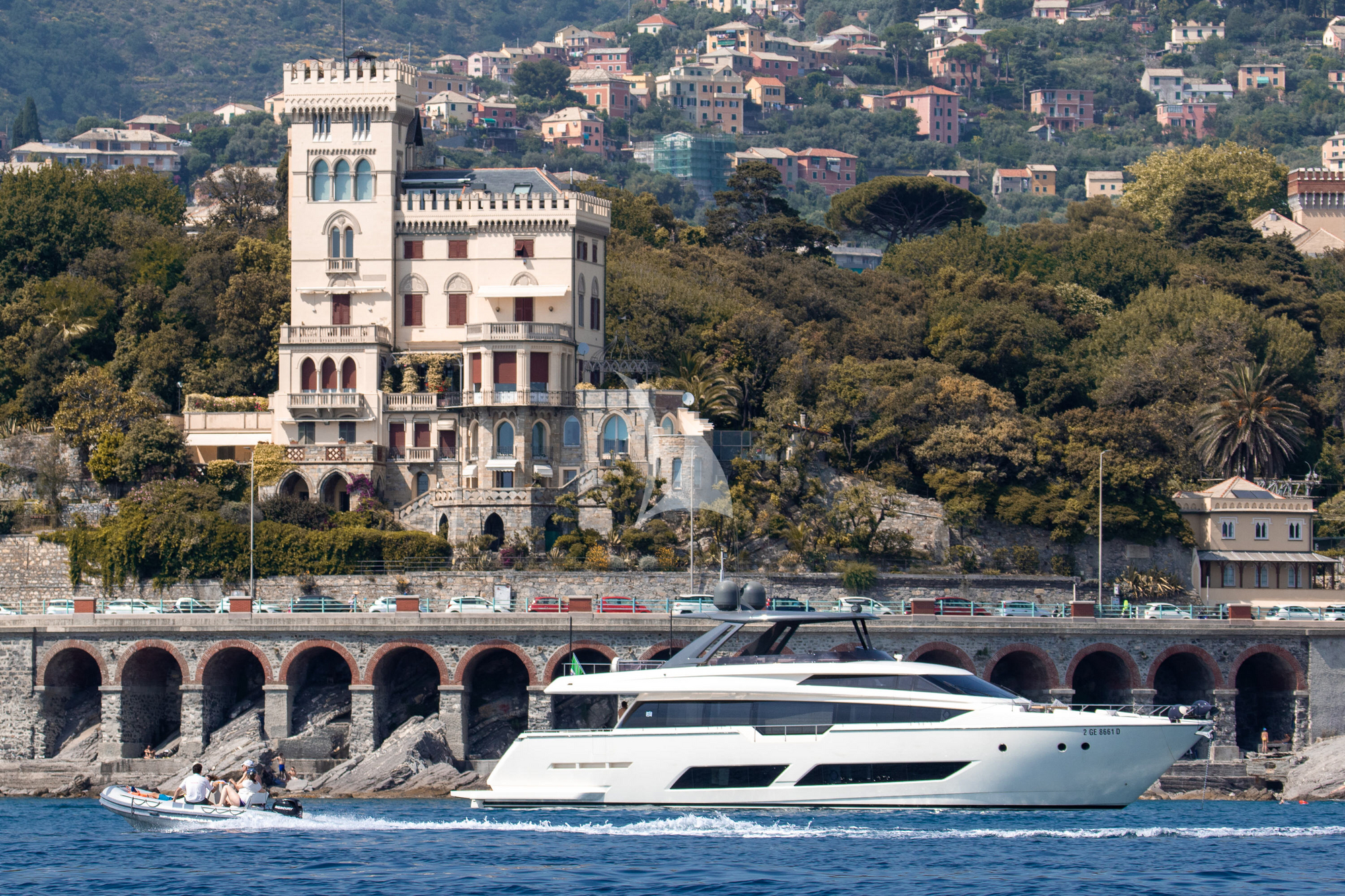 E3 is a Ferretti 850 motor yacht built in 2019, accommodating up to 8 guests across 4 cabins (3 double, 1 twin). Her design marries contemporary interiors with teak furnishings, creating spaces that feel both refined and welcoming. A professional crew of 4, led by Captain Rocco, attends to every detail whilst an onboard chef prepares regional Italian cuisine.