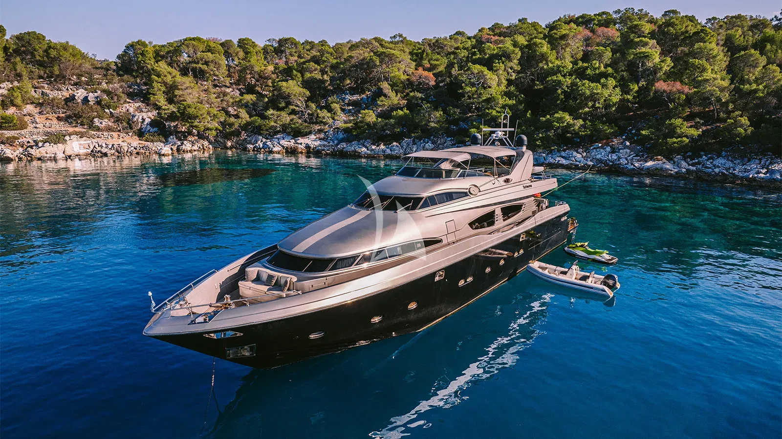 ELVI is a Posillipo Technema 95s motor yacht offering refined accommodation for up to 11 guests across five cabins, including a full-beam master suite on the main deck. A comprehensive 2021 refit maintains her interiors to the highest standard, combining soft cream furnishings with polished wood throughout, whilst her two-toned exterior presents instantly recognisable modern lines.