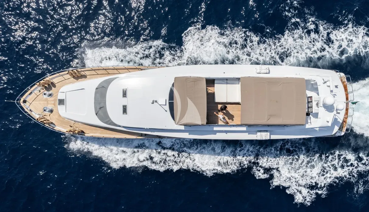 FAITH is a Tecnomar motor yacht built for guests who value refined simplicity and assured capability. Her design balances open social spaces with intimate private quarters, allowing each day to unfold naturally across the Côte d'Azur. The flybridge commands panoramic views along the coast near Cannes, while the teak-appointed interior and expansive windows create a sense of openness throughout the saloon and dining areas.