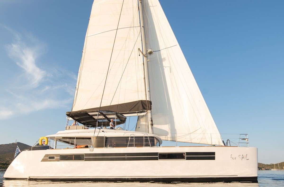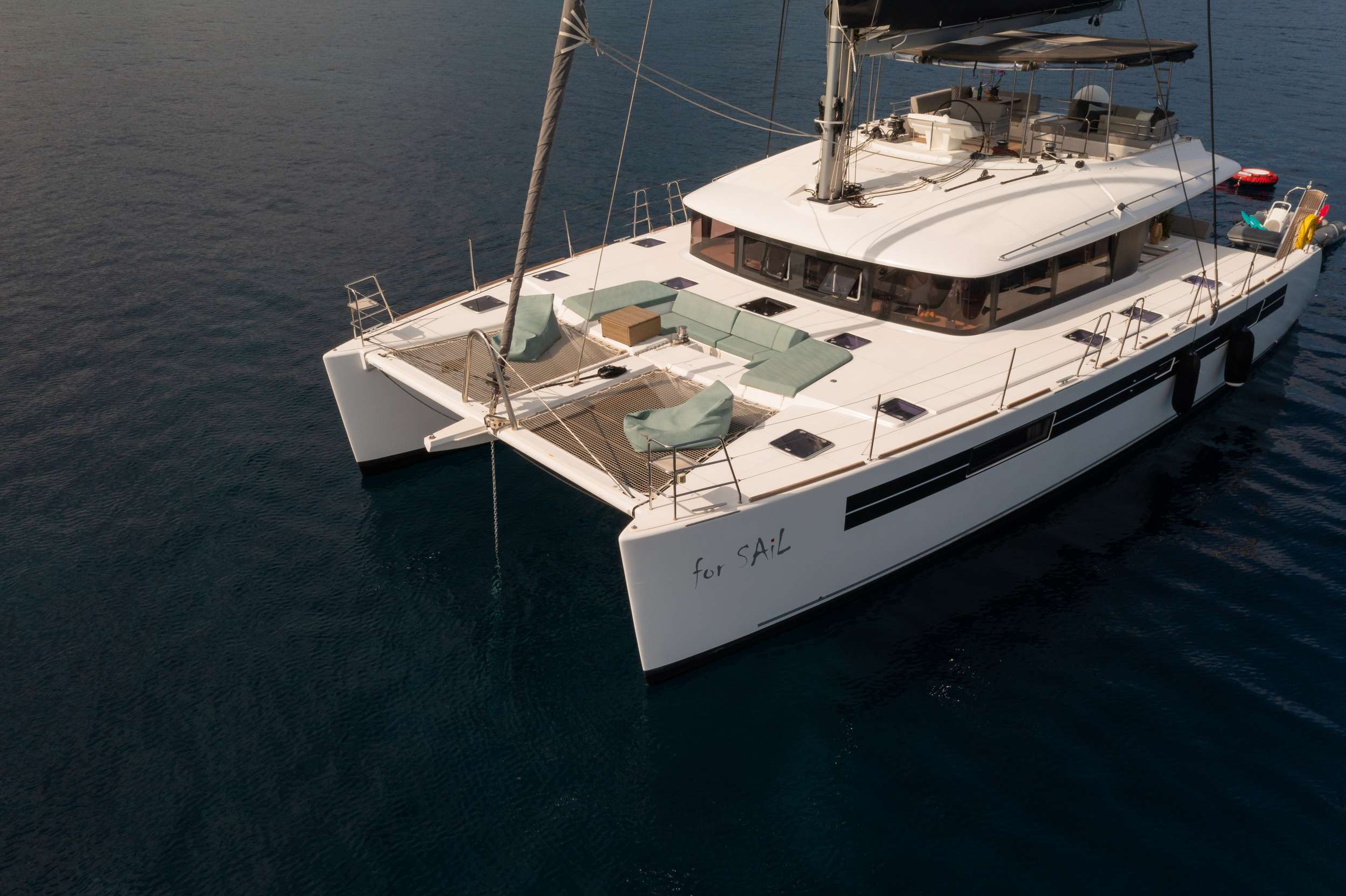 FOR SAIL is a Lagoon 560 catamaran offering intimate crewed charters across Greece's most coveted islands. Recently refitted with fresh furnishings and contemporary interiors, she accommodates ten guests across five cabins, combining spacious social areas with the stability and comfort that only a well-designed multihull provides. Her flybridge commands panoramic views; her main deck aft hosts extended gatherings; forward trampolines invite quiet contemplation.
