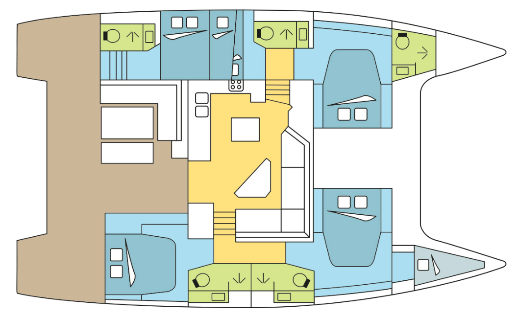 - •Six cabins with five en-suite heads, sleeping eleven guests across multiple configurations