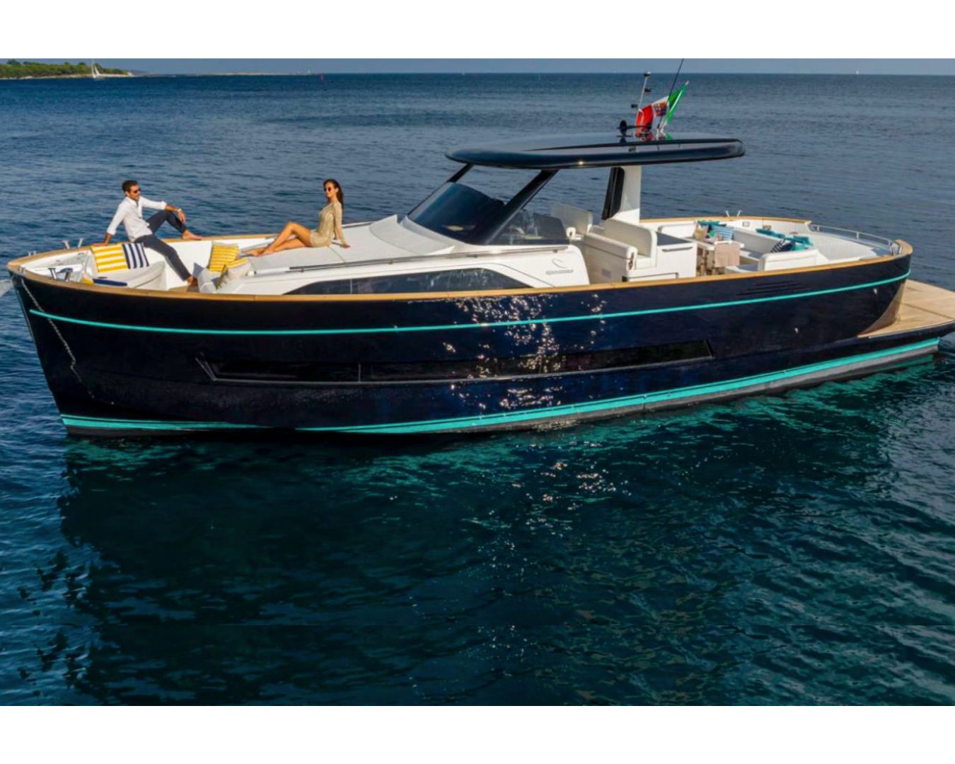 The Gozzo 45 combines timeless Italian design with 2022 construction, delivering a refined platform for entertaining along the Côte d'Azur. Her generous 26-square-metre cockpit features a C-shaped sofa and retractable dining table, anchoring social moments whether you're anchored off Cannes or cruising toward St Tropez. Shaded zones below provide respite from the Mediterranean sun.