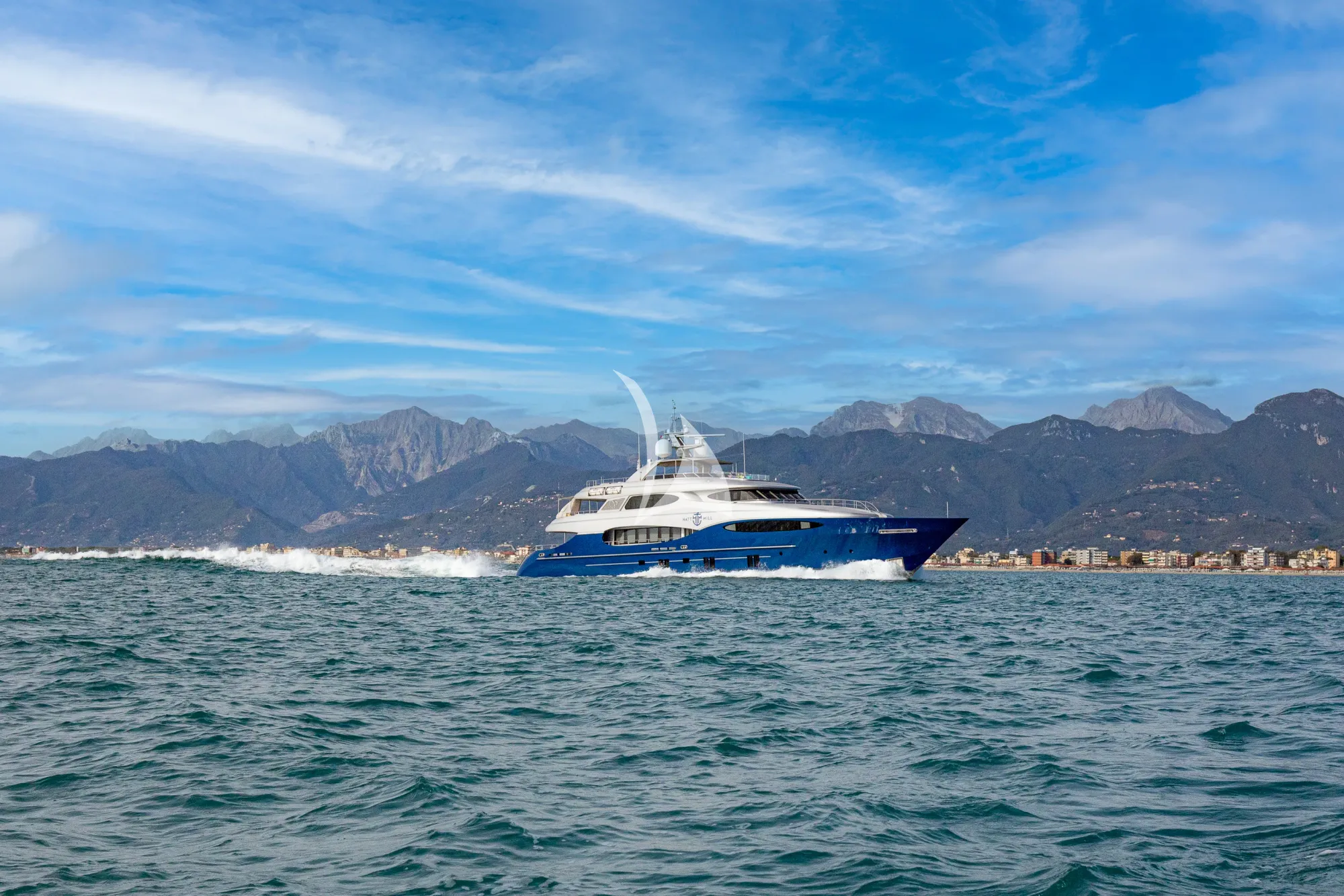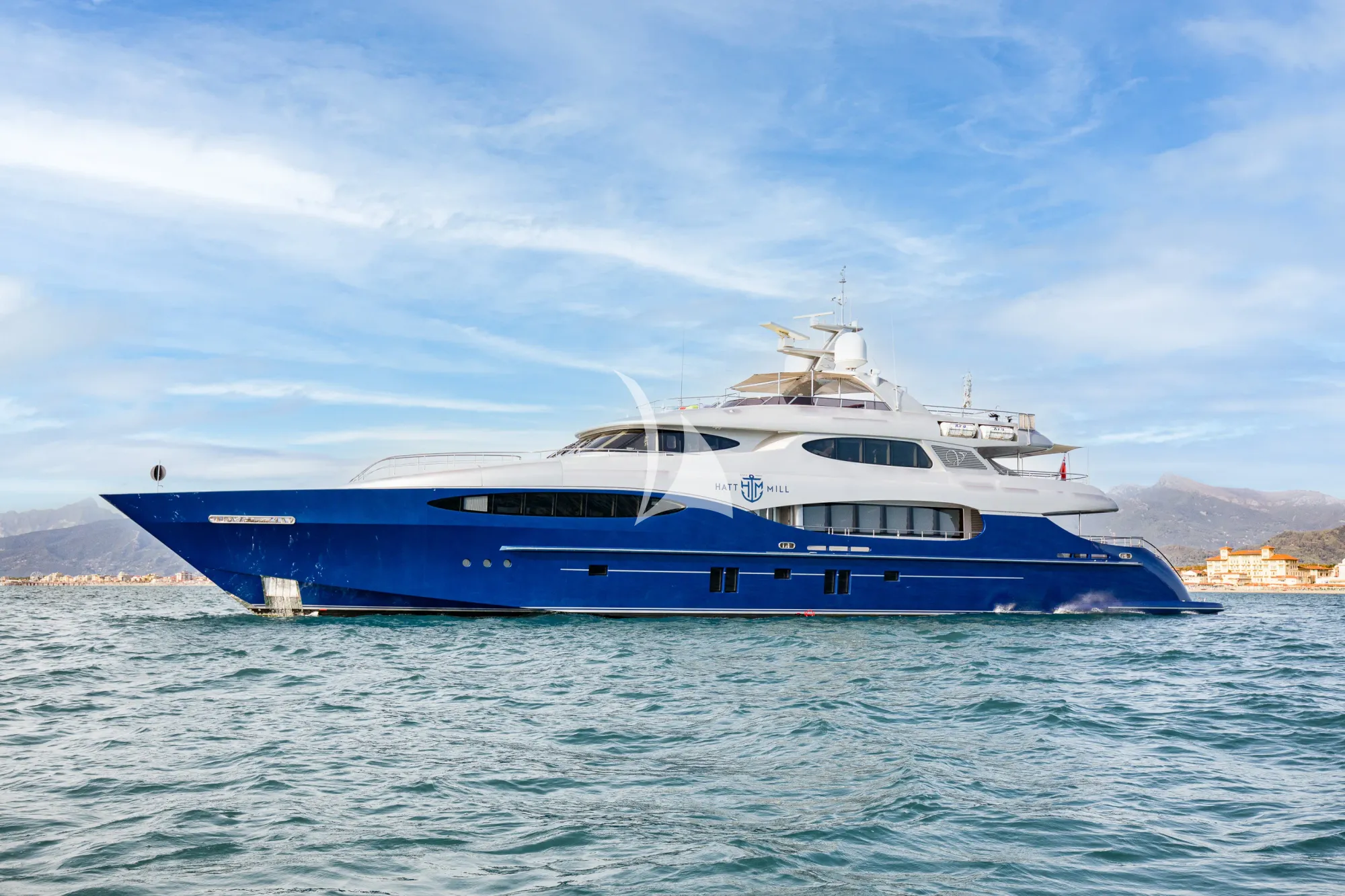 HATT MILL is a Vicem 46 Vulcan motor yacht launched in 2013, offering six cabins accommodating up to twelve guests with a dedicated crew of eight led by Captain Massimo. Her sleek metallic blue hull and purposeful design reflect the quality of her Italian construction, while her comprehensive amenity package and water toy collection position her as a serious contender for those seeking active coastal exploration paired with refined onboard living.