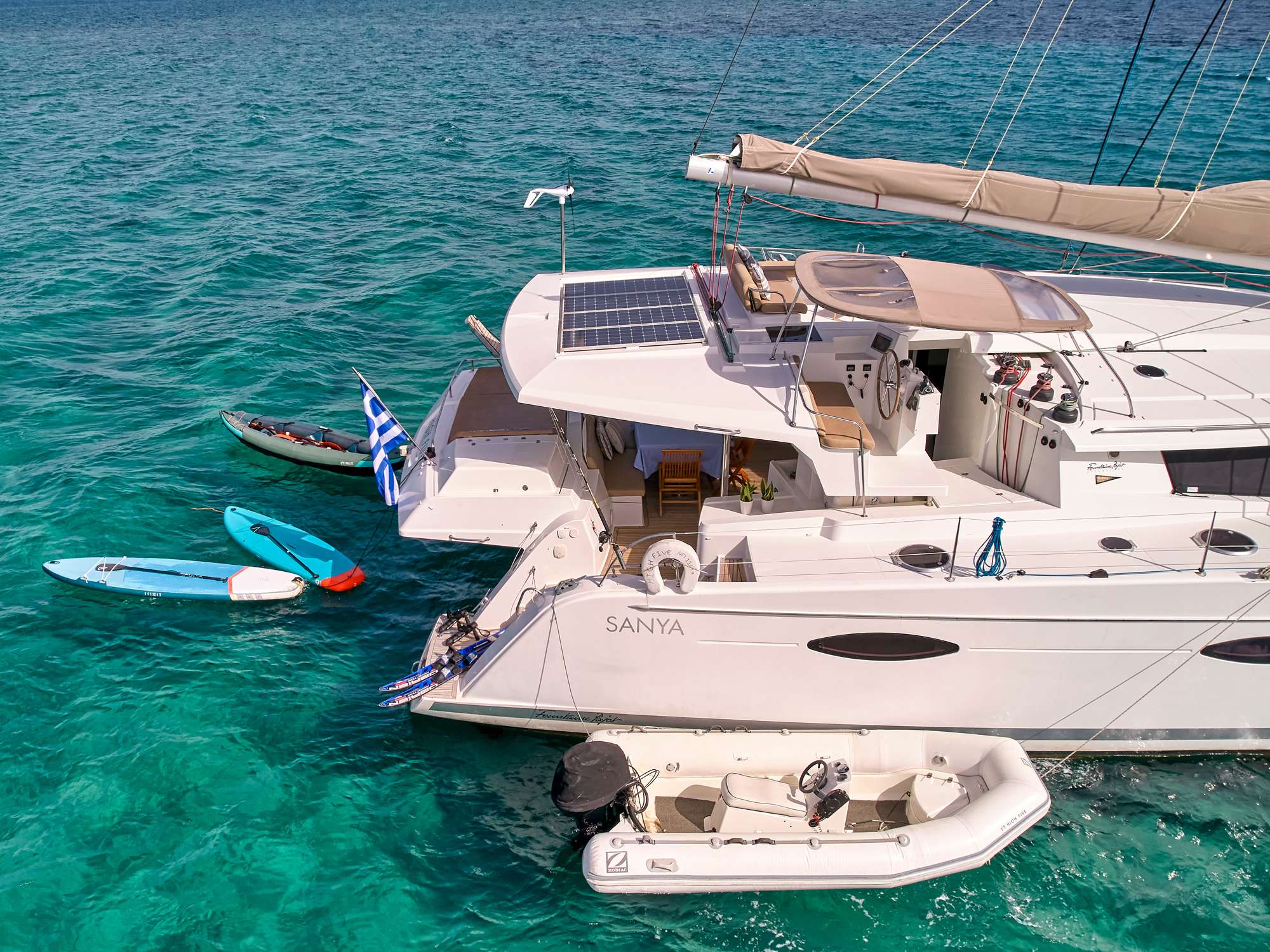 HIGH FIVE is a Fountaine Pajot Sanya 57 crewed catamaran offering five double cabins for ten guests. Based in Athens, she operates throughout the Cyclades and Aegean, delivering the balance of performance and comfort that discerning charterers expect. Her modern interior and generous deck spaces create an environment where relaxation and exploration coexist naturally.