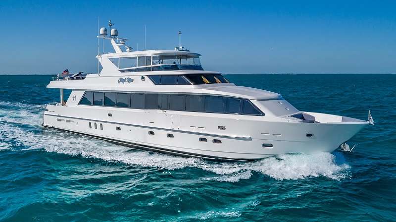 HIGH RISE is a Hargrave 101 motor yacht offering refined accommodation for up to 9 guests across 4 cabins. Her bespoke interior marries classical design with generous volumes, anchored by a main salon that doubles as an sophisticated entertaining hub, complete with marble-topped bar. The open sundeck provides the generous outdoor space essential for Bahamian cruising.