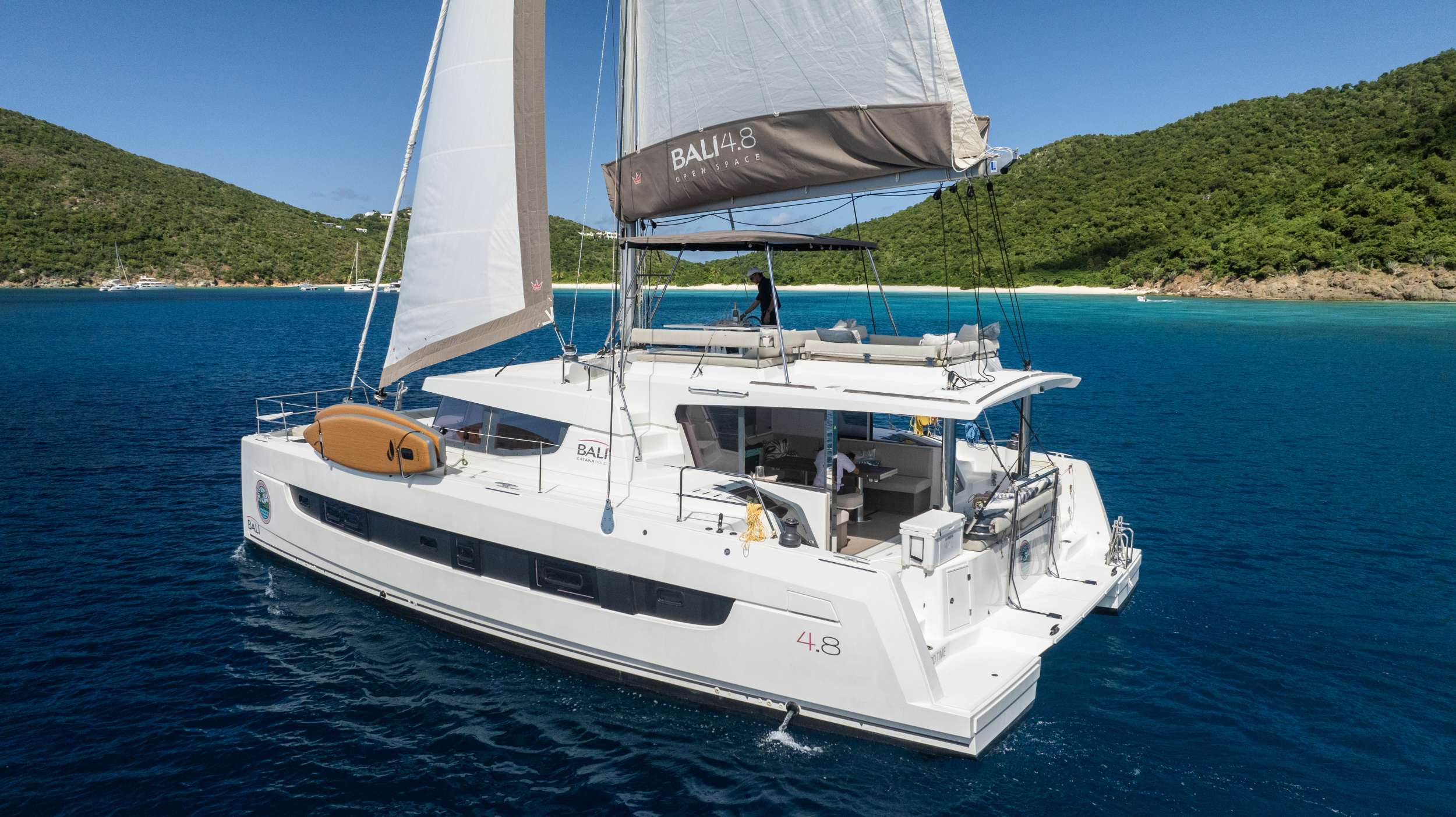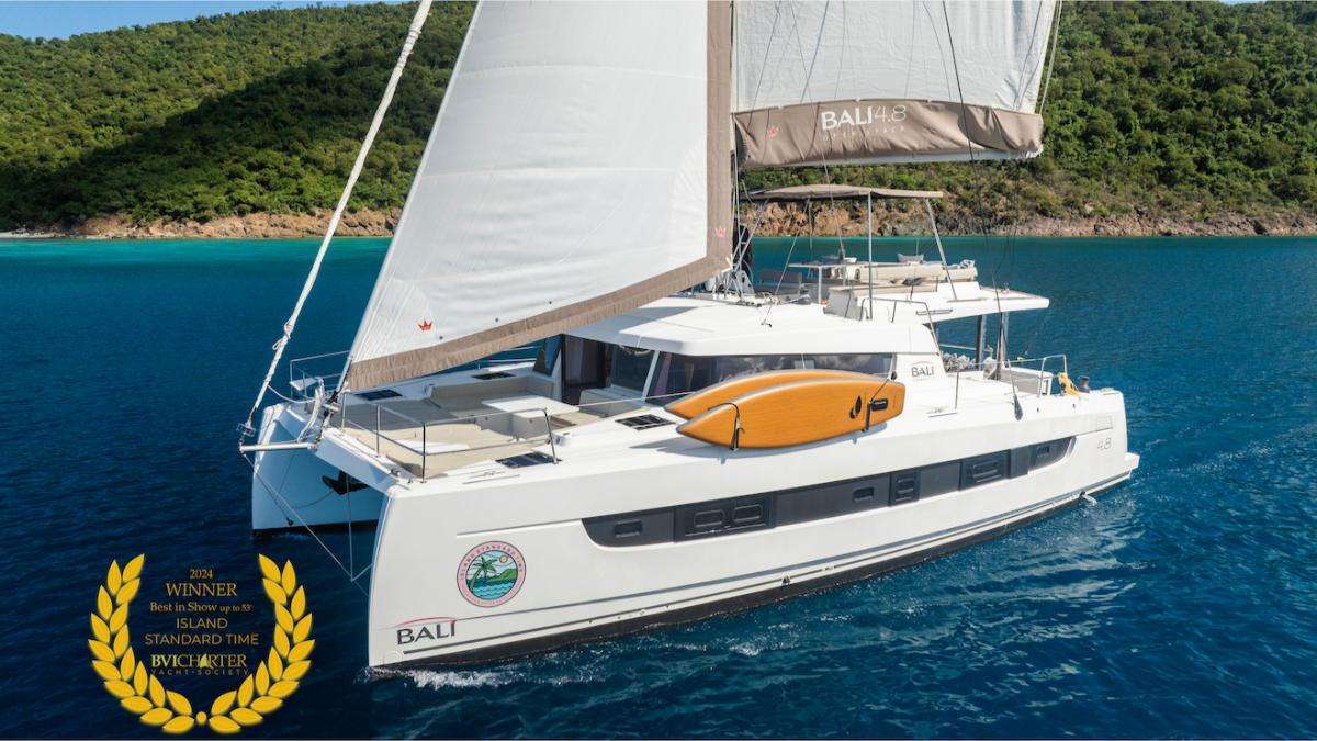 ISLAND STANDARD TIME is a Catana Bali 4.8 designed for discerning charterers seeking space, comfort, and responsive sailing across the Caribbean's most coveted waters. Four queen cabins accommodate eight guests in thoughtfully appointed surroundings, each with private en suite facilities. The yacht's open-plan living invites effortless entertaining, whether you're gathered in the air-conditioned saloon beneath panoramic wraparound windows or lingering over dinner on the aft deck as anchorages slip past.