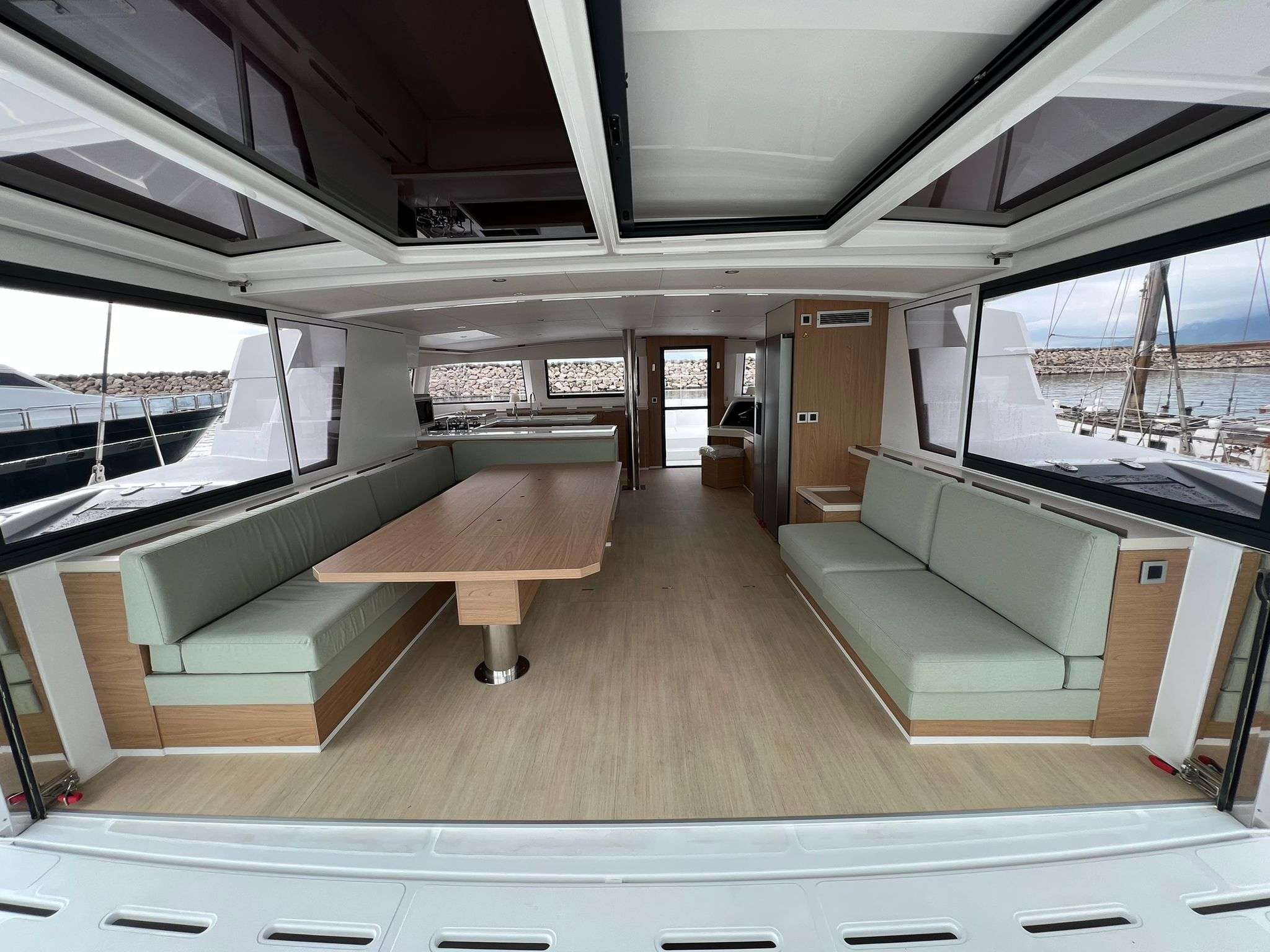 ITALY is a Bali 5.4 catamaran purpose-built for the Mediterranean. Her design balances performance under sail with the stability of twin hulls, delivering a composed passage through the Campanian Archipelago. Six cabins accommodate twelve guests across five doubles and one twin, each with ensuite facilities and teak joinery that speaks to thoughtful interior finishes.