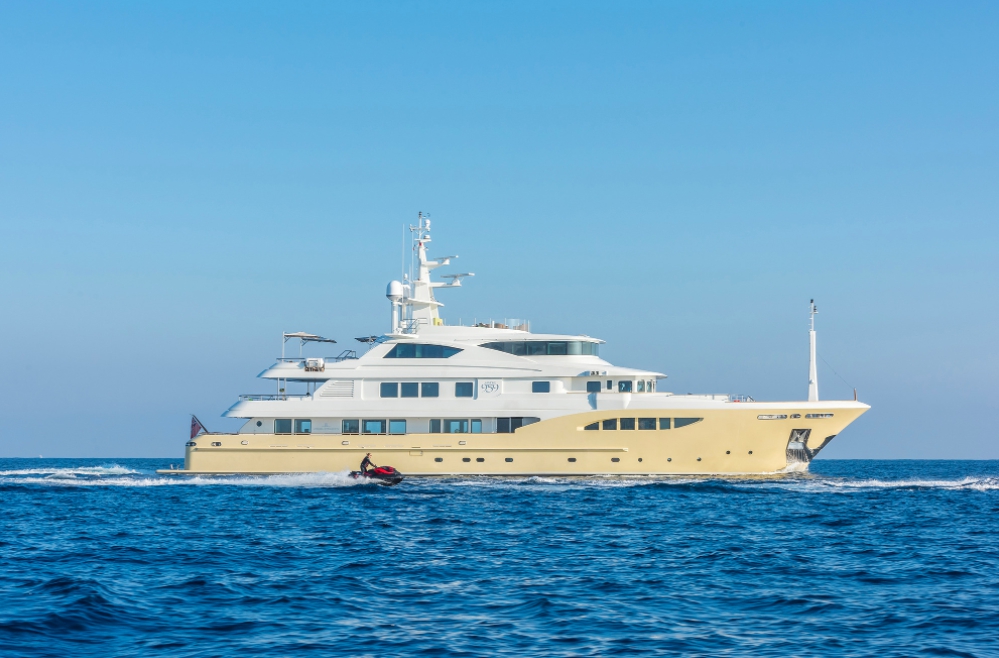 JADE 959 is a Jade Yachts motor yacht built in 2014, offering six cabins configured with four doubles, two twins, and one convertible berth to accommodate twelve guests. Her interiors reflect contemporary European design sensibility, with a vast main salon flowing into a separate breakfast room and formal dining space. These volumes accommodate both intimate gatherings and substantial entertaining with equal ease.