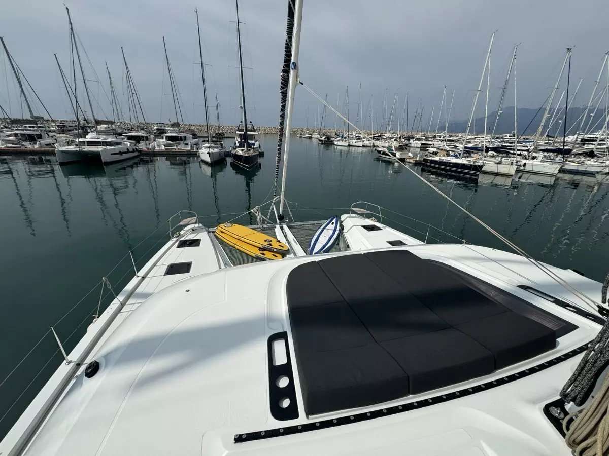 JELLYFISH is a 2024 Lagoon 55 catamaran offering five cabins with en-suite facilities, each finished in warm teak and accommodating up to ten guests. The vessel combines dual-hull stability with refined interiors, providing ample social space across her saloon, expansive foredeck, aft dining deck, and flybridge.