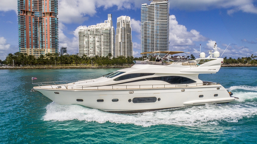 Charter the Joyce 84 Flybridge for intimate day excursions or extended week-long voyages across South Florida's coastline and the crystalline waters of the Bahamas. Your dedicated crew manages all hospitality, navigation, and seamless logistics, whilst you enjoy uninterrupted access to the yacht's refined spaces. Fuel for local cruising is included, as are fresh water, ice, and premium beverages. The combination of sophisticated interiors, versatile deck areas, and expert crew creates an experience of understated luxury tailored to HNW clientele seeking authentic maritime escape.