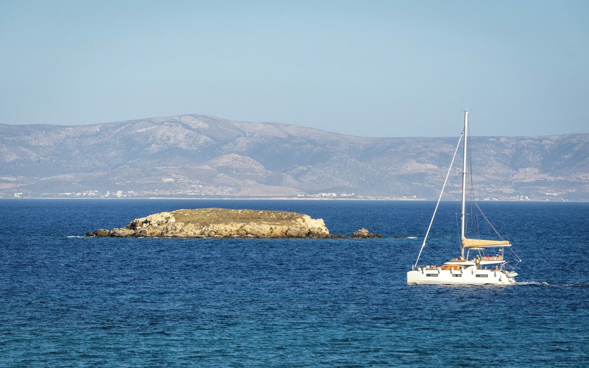 Lagoon 46 catamaran from Athens. Four cabins, eight guests, pure Aegean freedom.