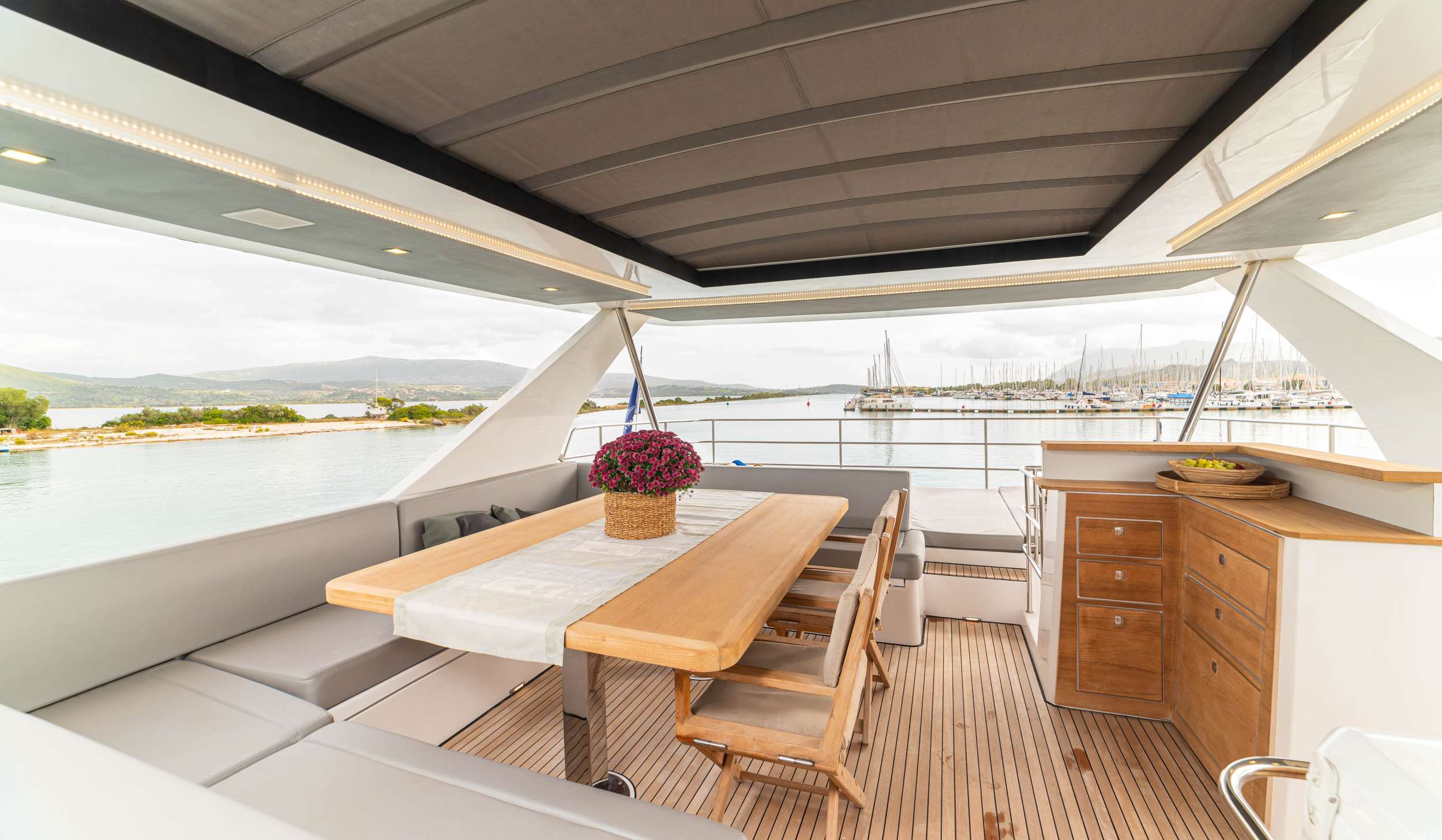 The interior balances sophisticated restraint with livability. A well-proportioned saloon flows naturally to the dining area and galley, arranged to encourage both intimate mornings and convivial evenings. Above deck, plush loungers on the flybridge and cushioned pads aft create layered spaces for relaxation or social gathering as the light shifts across the water.