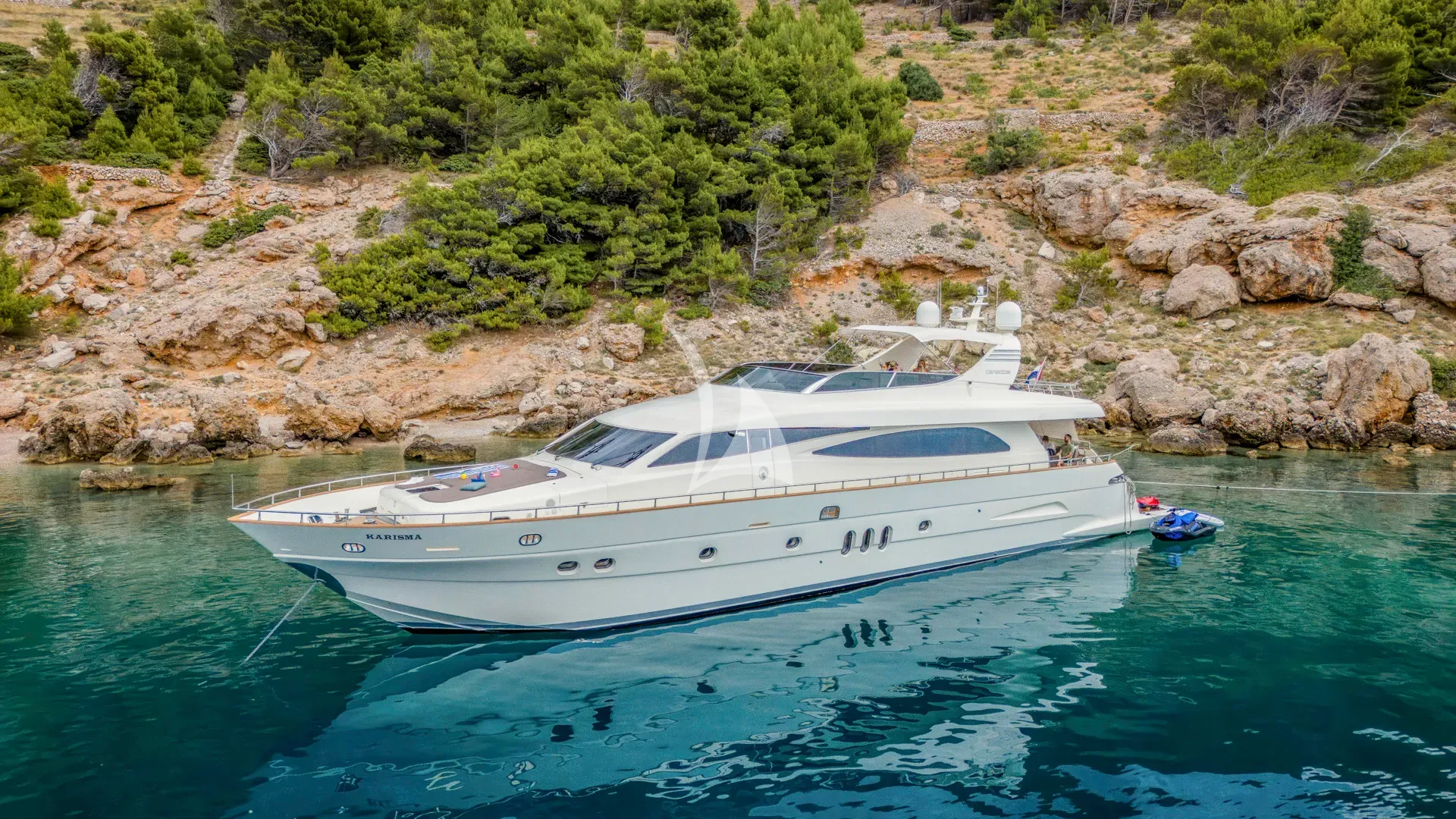 KARISMA is a Canados 86 motor yacht that combines sporty design with refined comfort across the Adriatic. Her four cabins accommodate up to eight guests, each with private ensuite bathrooms and appointed with contemporary furnishings. Floor-to-ceiling windows flood the interior with natural light, whilst the spacious flybridge provides the setting for morning coffee or sunset aperitifs with panoramic sea views.