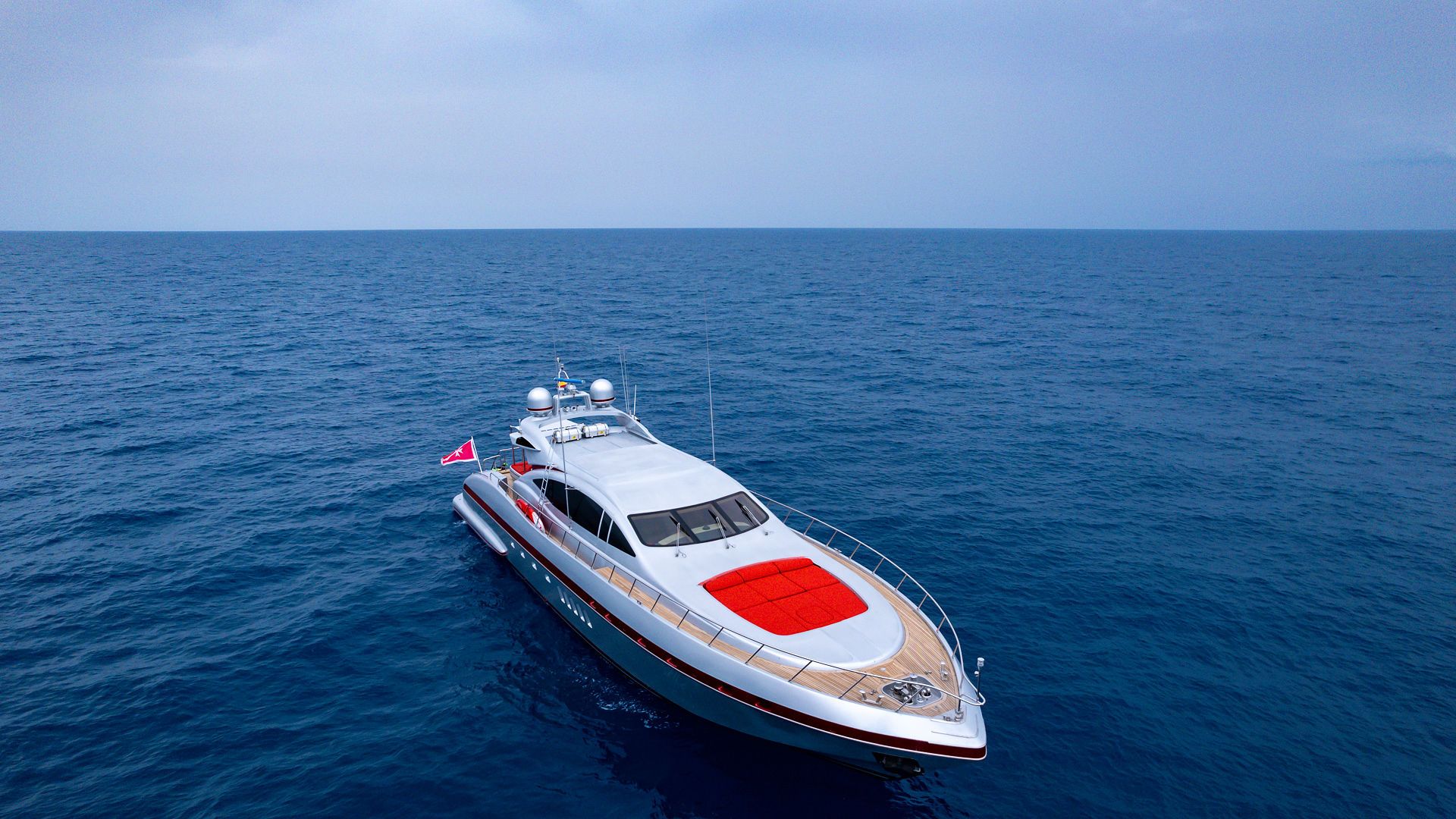 LA DIGUE is an Overmarine Mangusta 92 built to deliver refined cruising along Europe's most coveted coastlines. Her bold exterior conceals interiors awash with natural light, where teak joinery and contemporary furnishings create an understated sense of arrival. Four ensuite cabins accommodate nine guests in comfort, whilst the saloon and dining area serve as social anchors for your voyage.