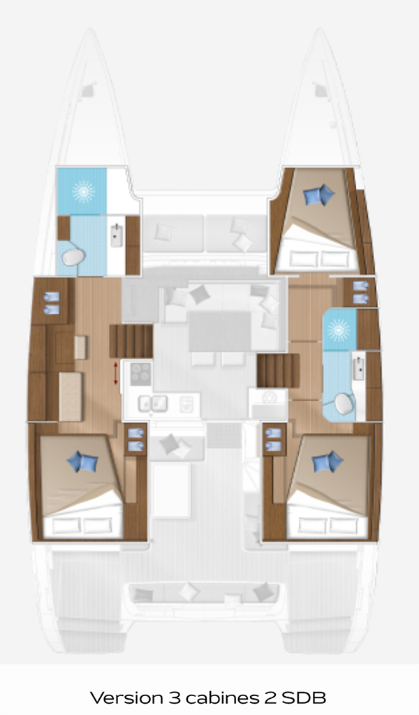 Lagoon's streamlined hull design preserves the generous beam these cats are known for, creating an unusually social interior without sacrificing performance under sail. This is a working yacht for those capable of handling her independently, or available with a professional skipper who berths in the fourth cabin.
