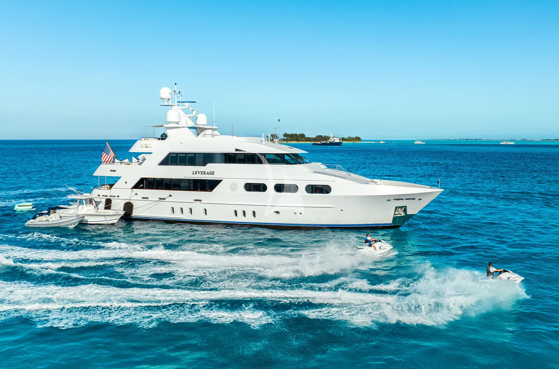 LEVERAGE is a Palmer Johnson 125 motor yacht built for those who demand both sophistication and substance. Her sleek profile cuts through Bahamian waters with effortless grace, whilst her recently refitted interiors blend contemporary elegance with genuine comfort. Expansive glass windows frame horizon after horizon, transforming her saloon into a living gallery of turquoise seas and island vistas.