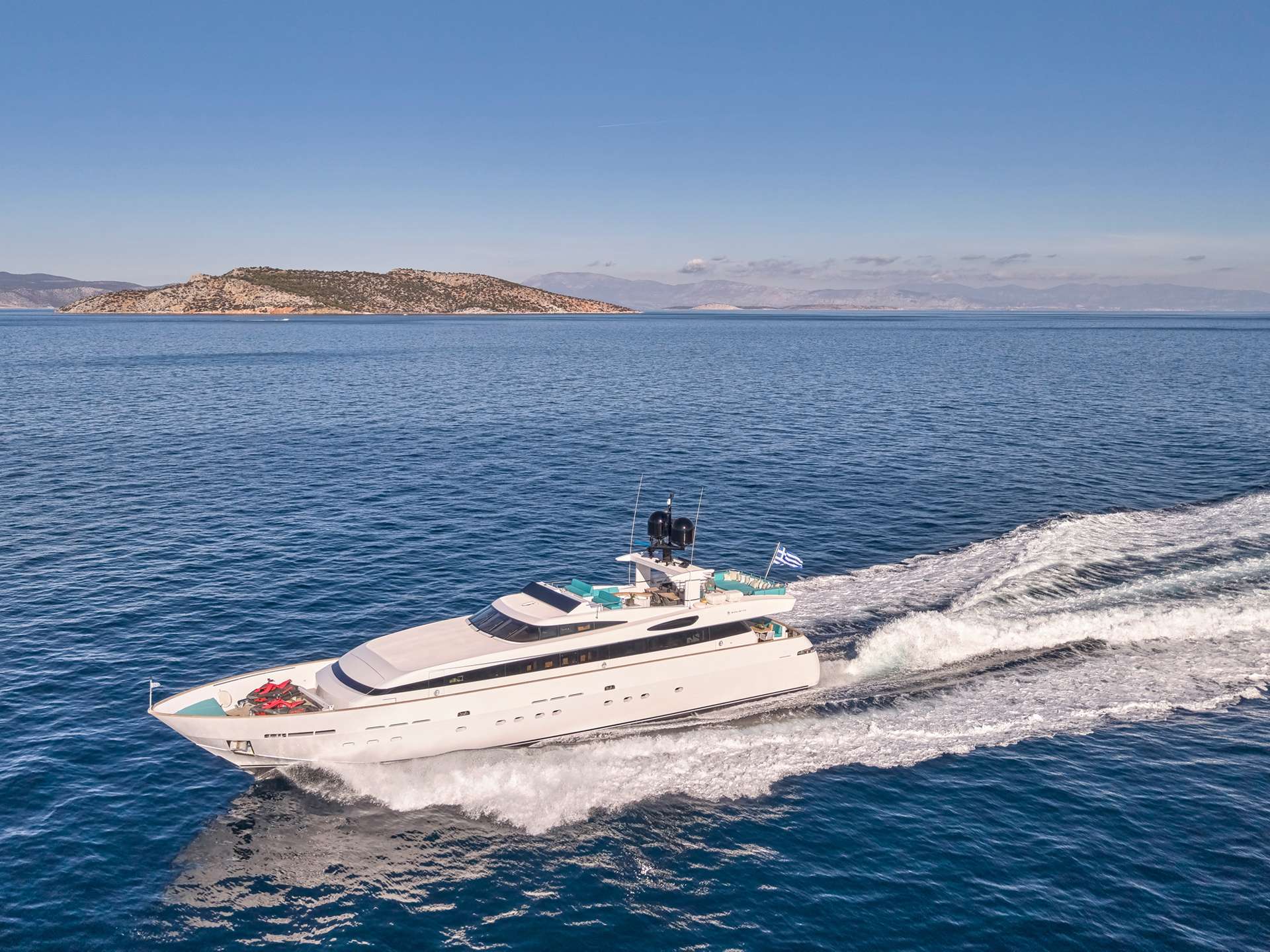 Her sundeck is generously proportioned for al fresco dining, sunbathing, and evening gatherings. The onboard tender and water sports collection—including two SeaBobs and jet skis—extends the experience beyond the yacht itself, whilst a professional crew attends to all details of your voyage.