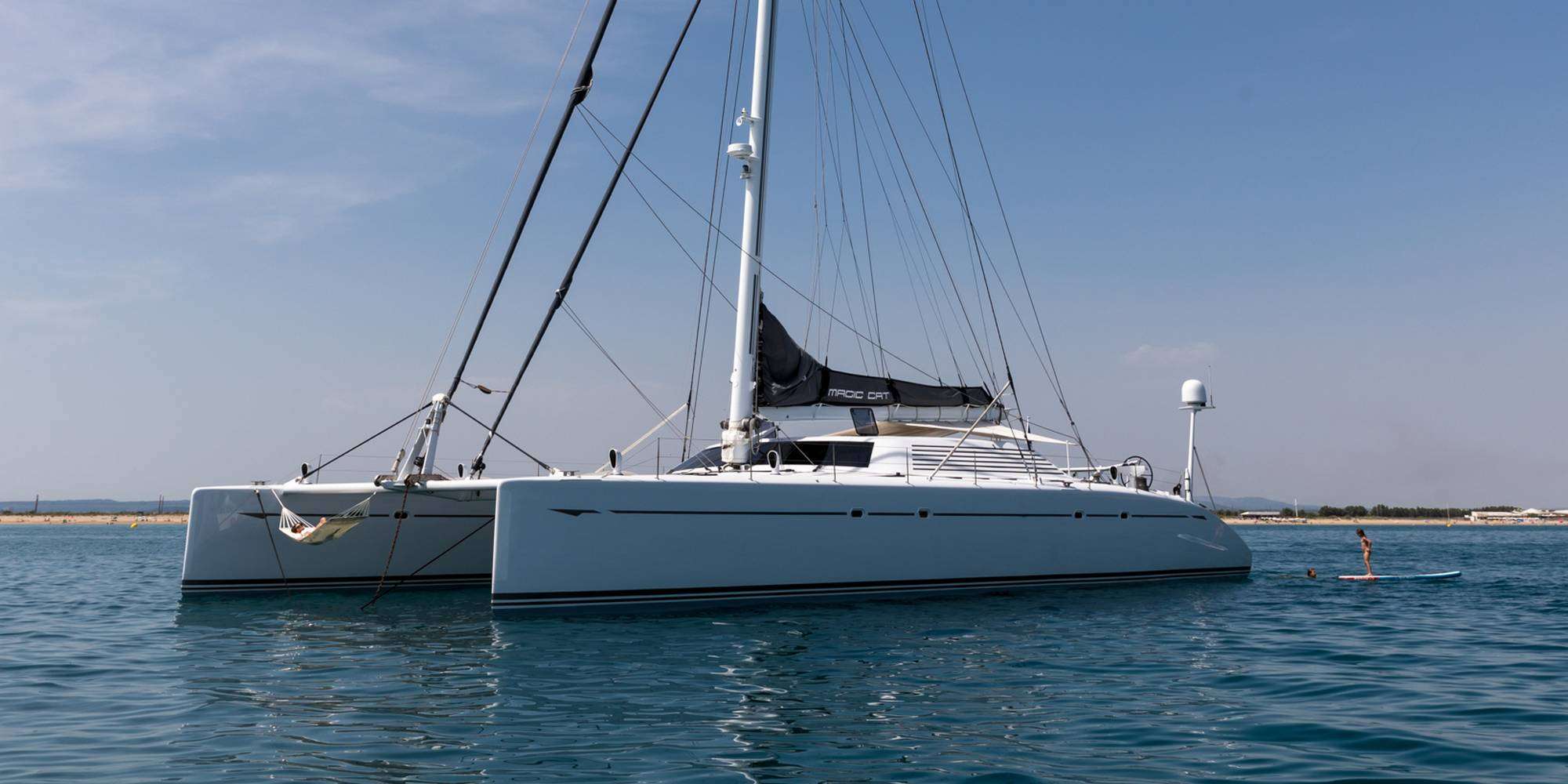 MAGIC CAT is a Multiplast catamaran offering refined accommodation across four double cabins, each with ensuite facilities. The saloon combines warm wood tones with leather furnishings and entertainment systems suited to intimate gatherings, while the flybridge provides an open-air vantage point for observing the horizon or evening entertaining.