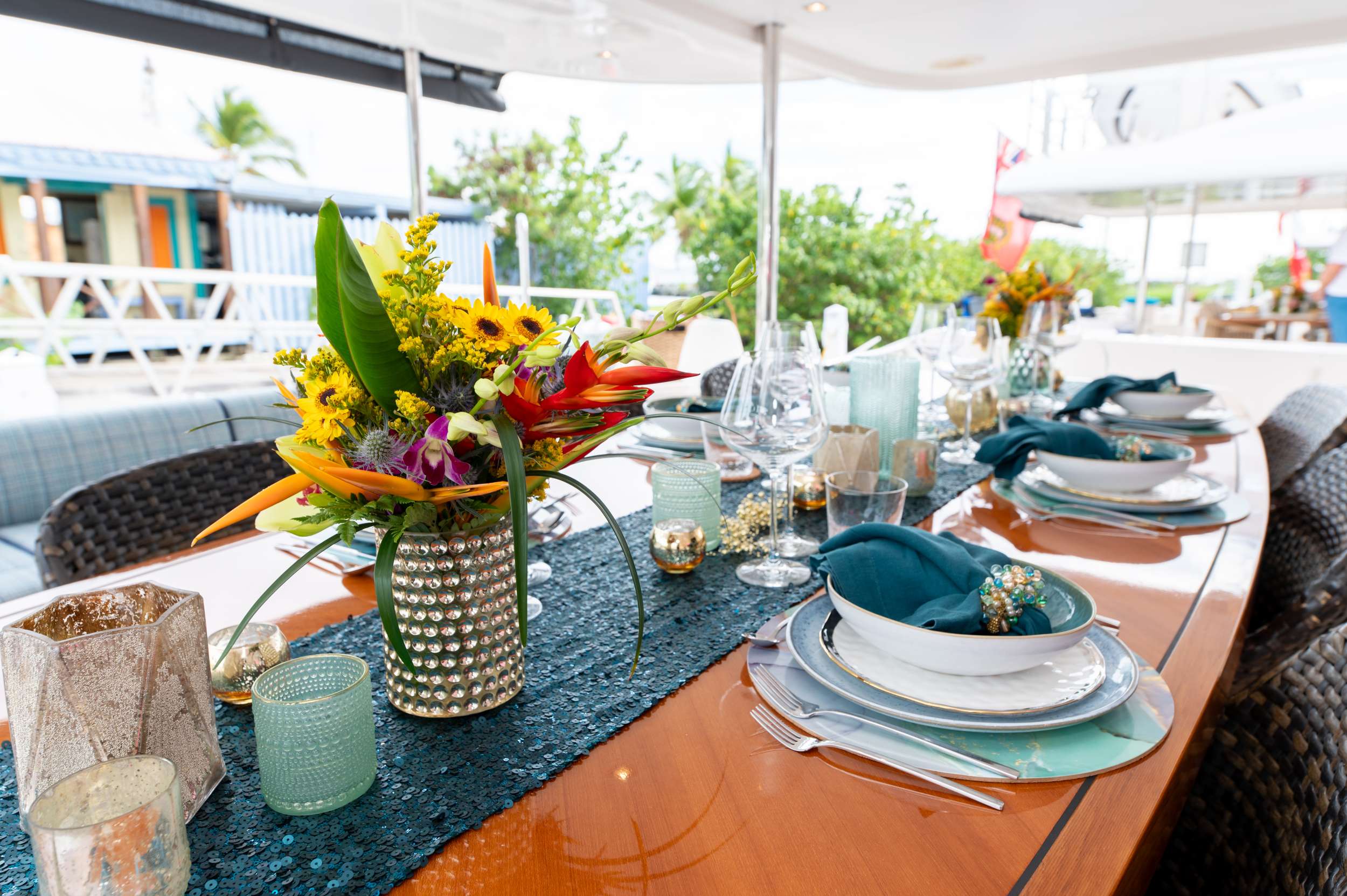 The yacht's layout prioritizes comfort and connection. An expansive foredeck with cushioned lounging invites unhurried days under sail, whilst the covered flybridge serves as an intimate vantage point for island watching. The aft deck accommodates dining al fresco, where Chef Gi's menus take full advantage of local seafood and her Portuguese-influenced approach to contemporary cuisine. Throughout, MUCHO GUSTO feels uncluttered and purposeful rather than ostentatiously appointed.