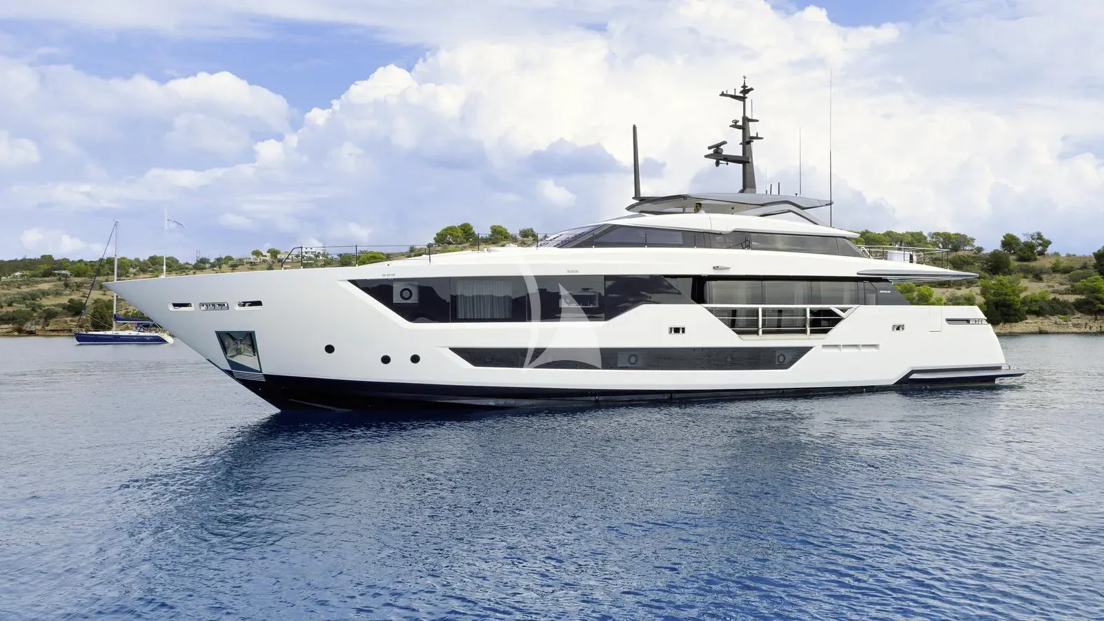 MY MISTAKE is a Ferretti Custom Line 106 completed in 2022, combining Italian design sensibility with the performance and comfort expected of a modern luxury motor yacht. Her contemporary interiors feature expansive glazing throughout the main saloon and dining area, flooding accommodation spaces with natural Aegean light. Five thoughtfully appointed cabins sleep ten guests across three double and two twin configurations, each offering private sanctuary between days of island exploration.