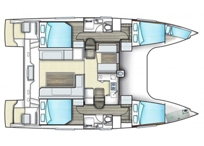 The Nautitech Open 40 redefines bareboat comfort with her signature open-plan cockpit and saloon, where living space flows seamlessly into the tropical air. Twin hulls deliver stable, responsive sailing across the Andaman without compromise on performance or ease of handling. Five cabins accommodate groups of family and friends with genuine breathing room—four doubles, one single, plus convertible berths in the saloon—each hull served by a full bathroom.