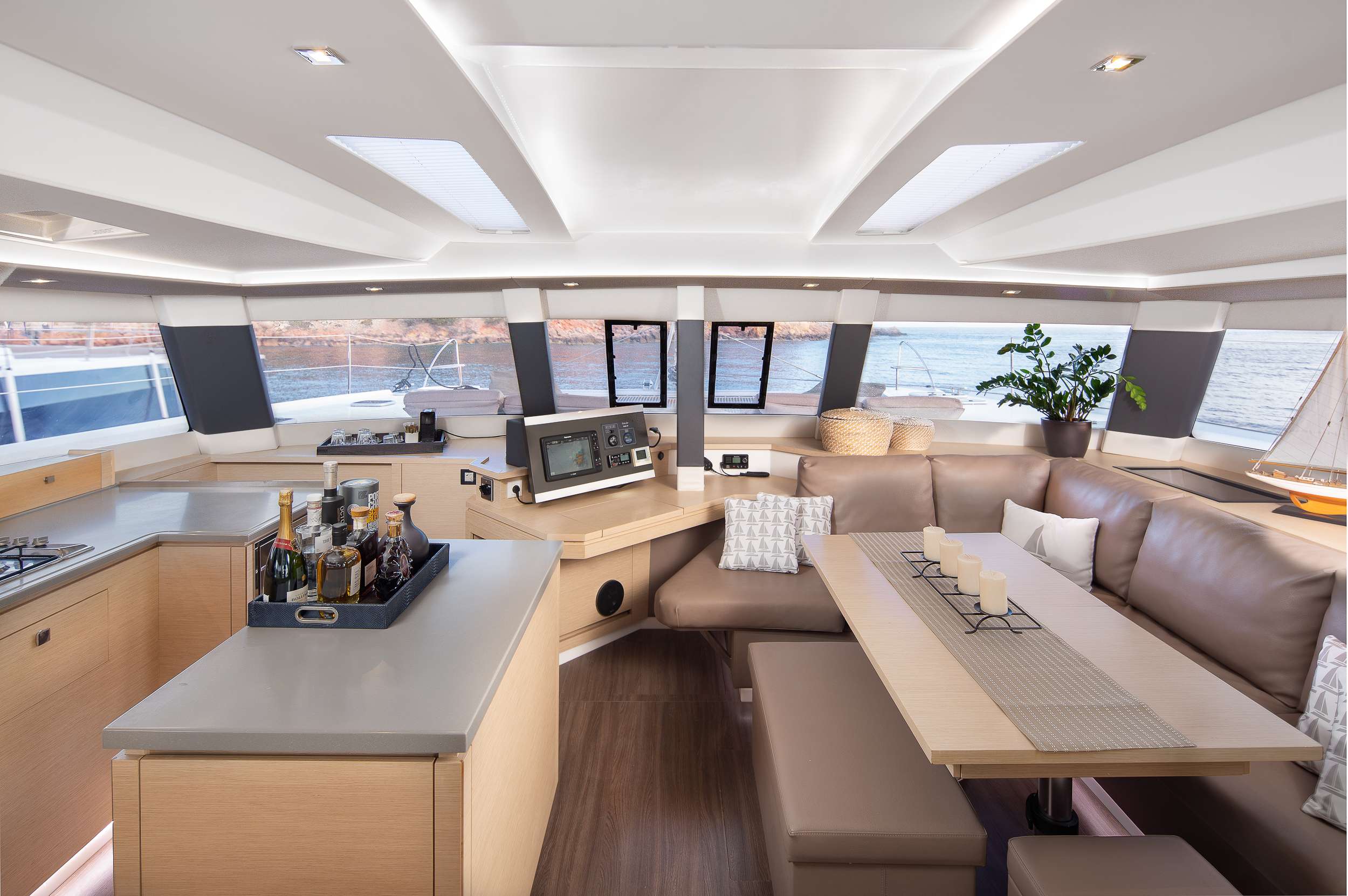Deck life centres on the twin trampolines forward, the generous aft dining platform, and a flybridge with unobstructed views. The saloon and dining area flow naturally, creating flexible social spaces for groups. Below deck, the interior combines natural light with thoughtful proportions, ensuring comfort during both active days and leisurely evenings at anchor.