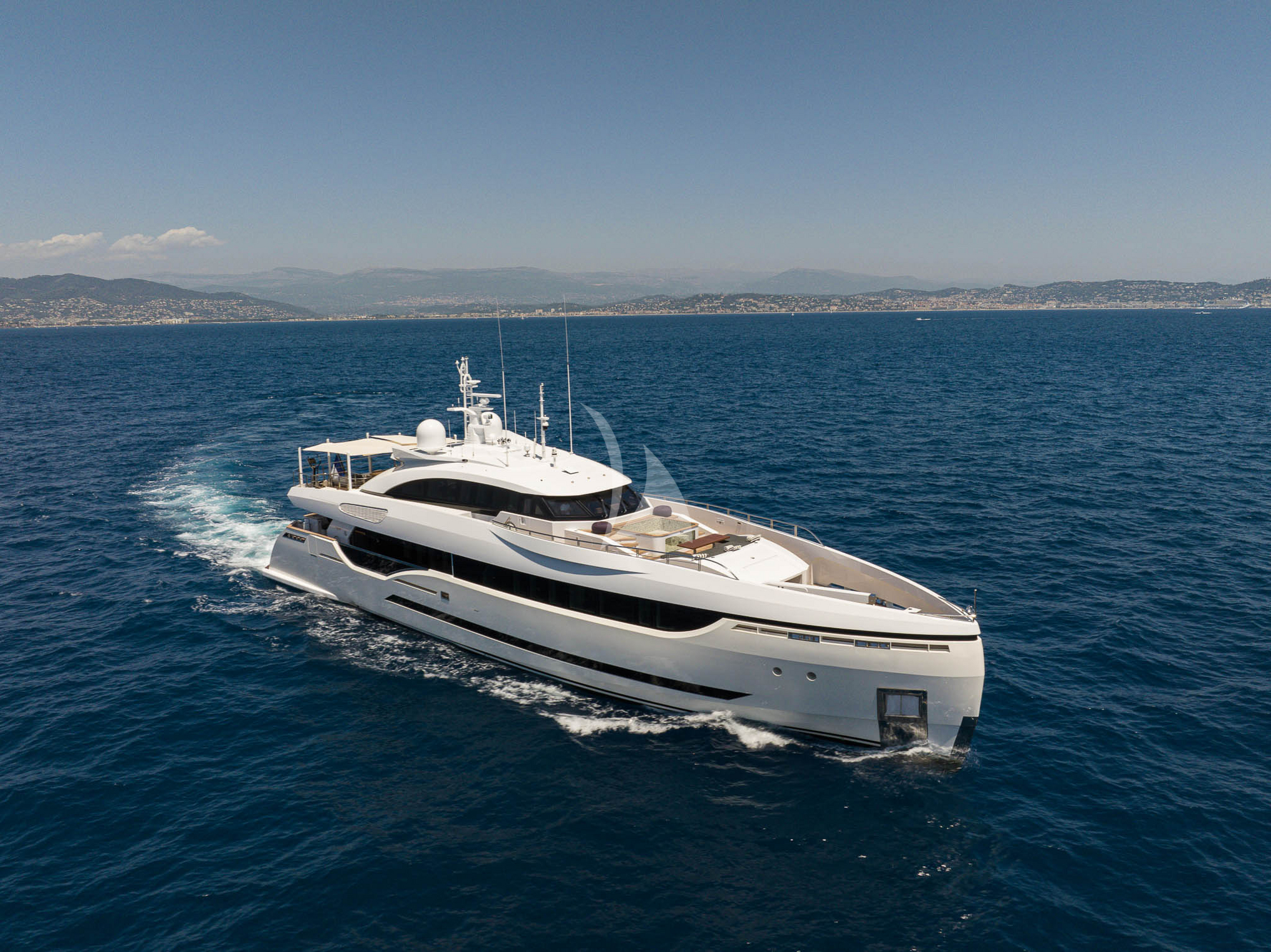 The yacht's exterior prioritises al fresco living. A flybridge sun deck commands panoramic views of the Côte d'Azur, whilst the foredeck hosts an integrated jacuzzi. The aft deck is appointed for alfresco dining, ideal for chef-prepared suppers anchored off Port Grimaud or Îles d'Hyères. Sun beds and lounging zones flow throughout, designed for both active days and indulgent relaxation.