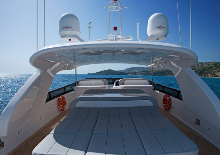 Outdoor living is equally considered. The flybridge provides ample sun exposure, whilst the main deck offers shaded lounging and dining areas. A full complement of water toys including two tenders, Yamaha jet skis, water skis, and diving equipment caters to active guests. Premium audio-visual systems throughout the yacht ensure entertainment options for quieter afternoons.