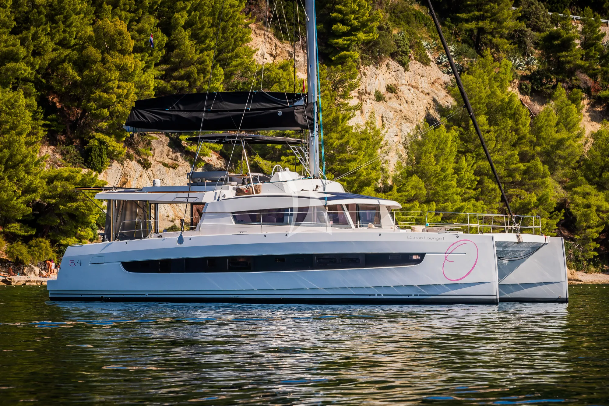 OCEAN LOUNGE is a Catana Bali 5.4 completed in 2022, purpose-built for the Greek islands. Her catamaran hull delivers stability and shallow-draft access to remote anchorages across the Cyclades and Aegean, whilst her generous beam creates naturally bright, naturally ventilated living spaces. The yacht accommodates ten guests across five cabins, each finished with teak and creamy tones, creating a coherent aesthetic of understated refinement rather than ostentation.