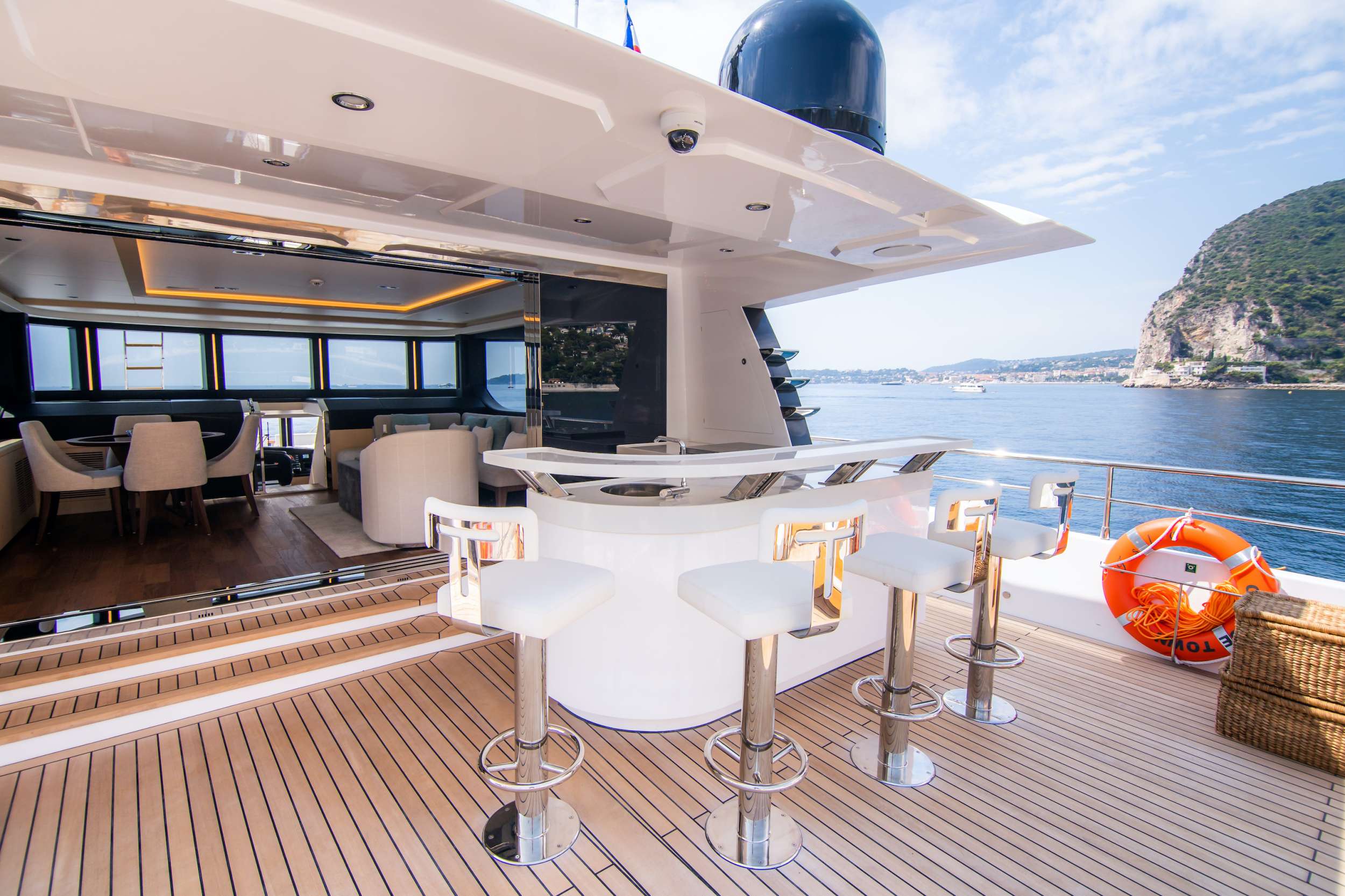 On deck, OCEAN VIEW prioritises social spaces for discerning clientele. The expansive flybridge hosts cocktail hours with cushioned seating and a dedicated minibar, whilst the stern features a full alfresco dining area perfect for Mediterranean sunsets. A bow lounge with sunbathing area and an integrated mini pool complete the leisure offerings. Captain Alejandro Sempere leads a professional five-person crew, with Chef Souad Meftahi curating gourmet menus throughout your voyage.