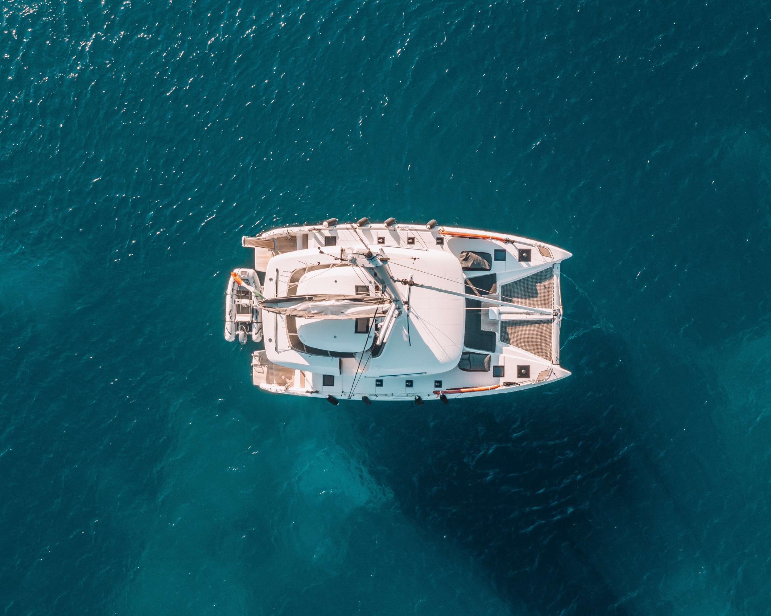 Outdoor living dominates the layout. The expansive aft deck accommodates all eight guests for sunset dinners, whilst the foredeck and flybridge provide quieter vantage points for morning coffee or stargazing. Minimalist interiors flow seamlessly between cabin and saloon, creating an airy atmosphere throughout.
