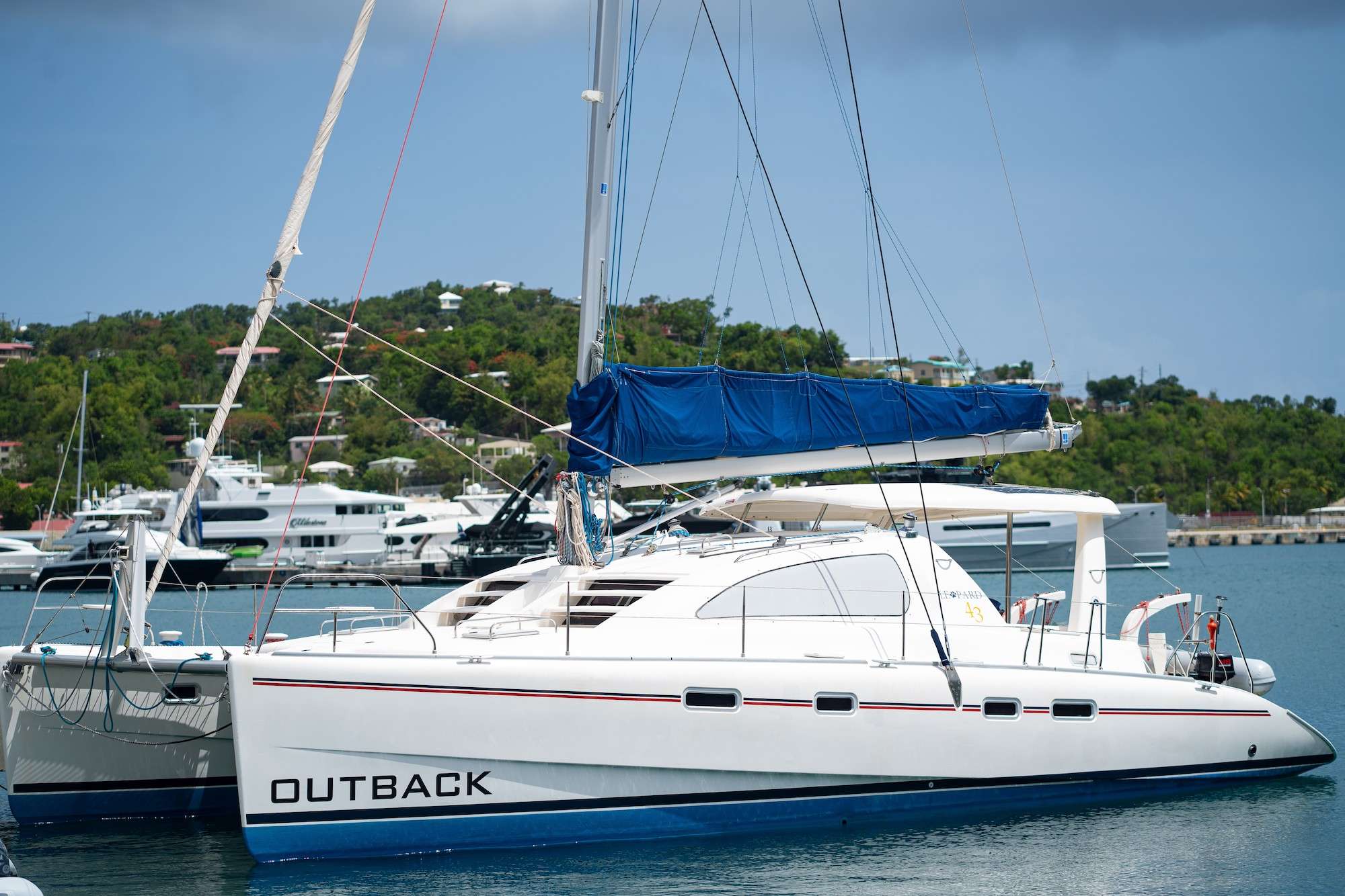 OUTBACK is a Leopard 43 catamaran offering intimate exploration of the Virgin Islands with the luxury of a dedicated crew. Her twin-hull design provides the stability and spaciousness that separates catamarans from monohulls, with generous exterior decks and light-filled interiors. Three queen cabins plus two additional forward berths accommodate up to eight guests, each cabin featuring air-conditioning, walk-around beds, and private heads.