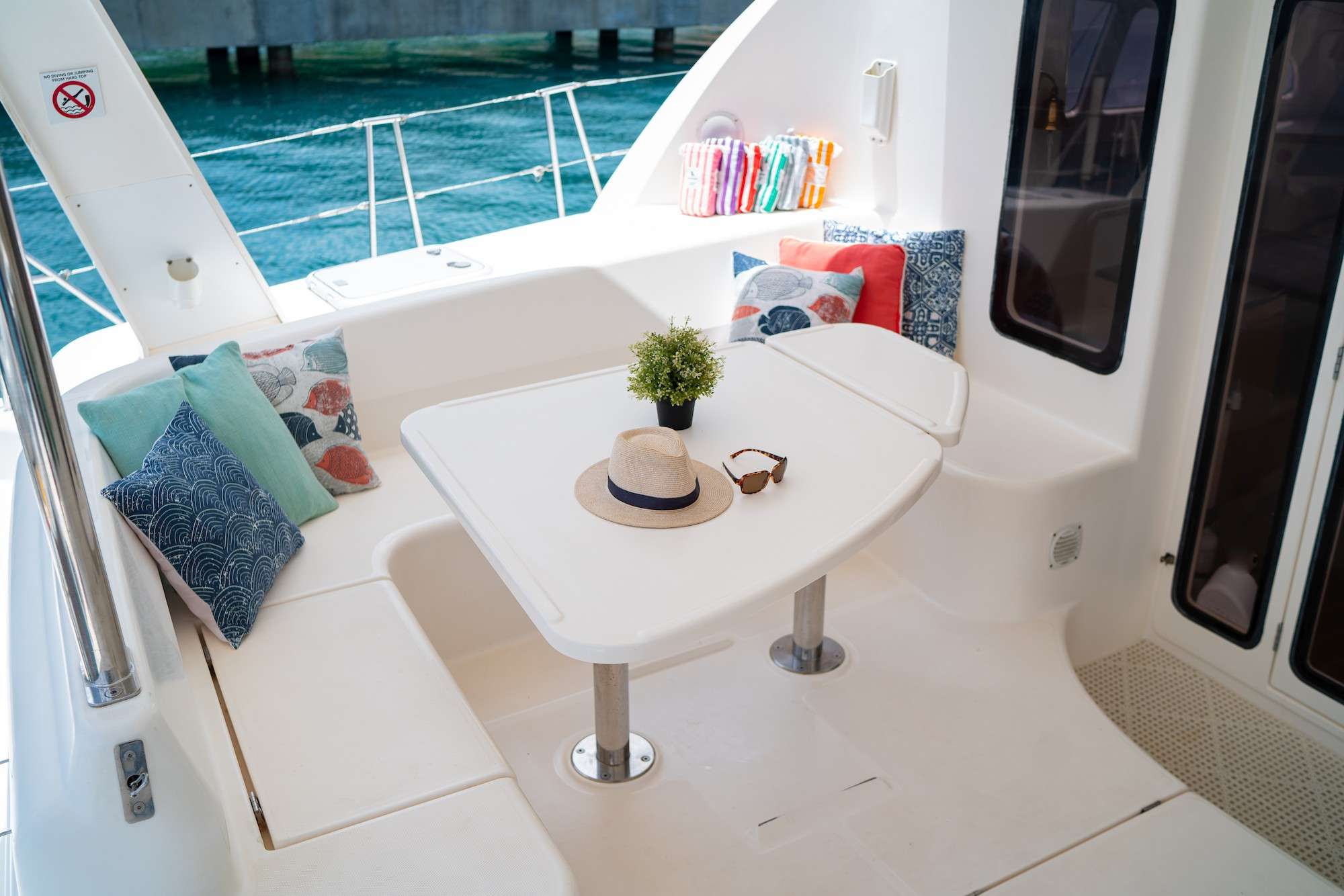 The large aft cockpit serves as the hub of your charter, providing shaded dining and relaxation space that defines life aboard. Generous foredeck areas invite you to settle in with morning coffee or evening cocktails as you cruise between islands. Inside, the salon and galley are thoughtfully proportioned, allowing the crew to deliver restaurant-quality meals without feeling cramped.