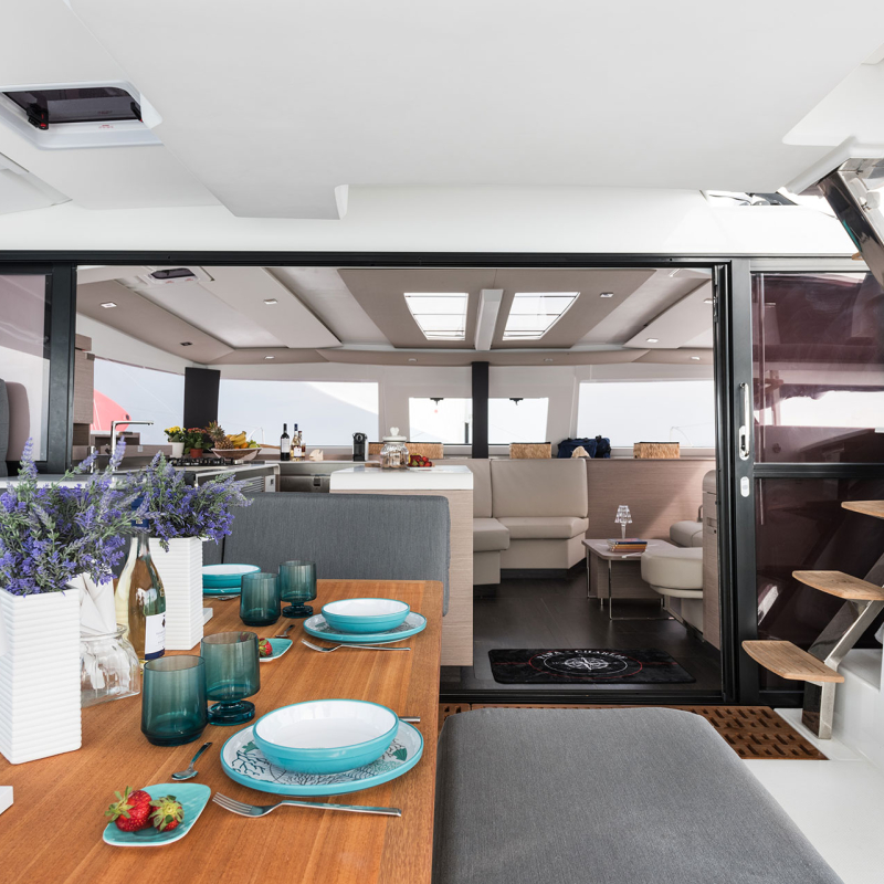 PAPA CHARLIE is a 2023 Fountaine Pajot Aura 51 offering refined sailing through Sardinia's most coveted waters. Her four double cabins accommodate eight guests in understated luxury, each designed with natural light and ensuite facilities. The catamaran's spacious saloon features floor-to-ceiling glazing that dissolves boundaries between interior and seascape, whilst her expansive deck plan spans foredeck bronzing areas, aft dining platform, and elevated flybridge for uninterrupted Mediterranean vistas.