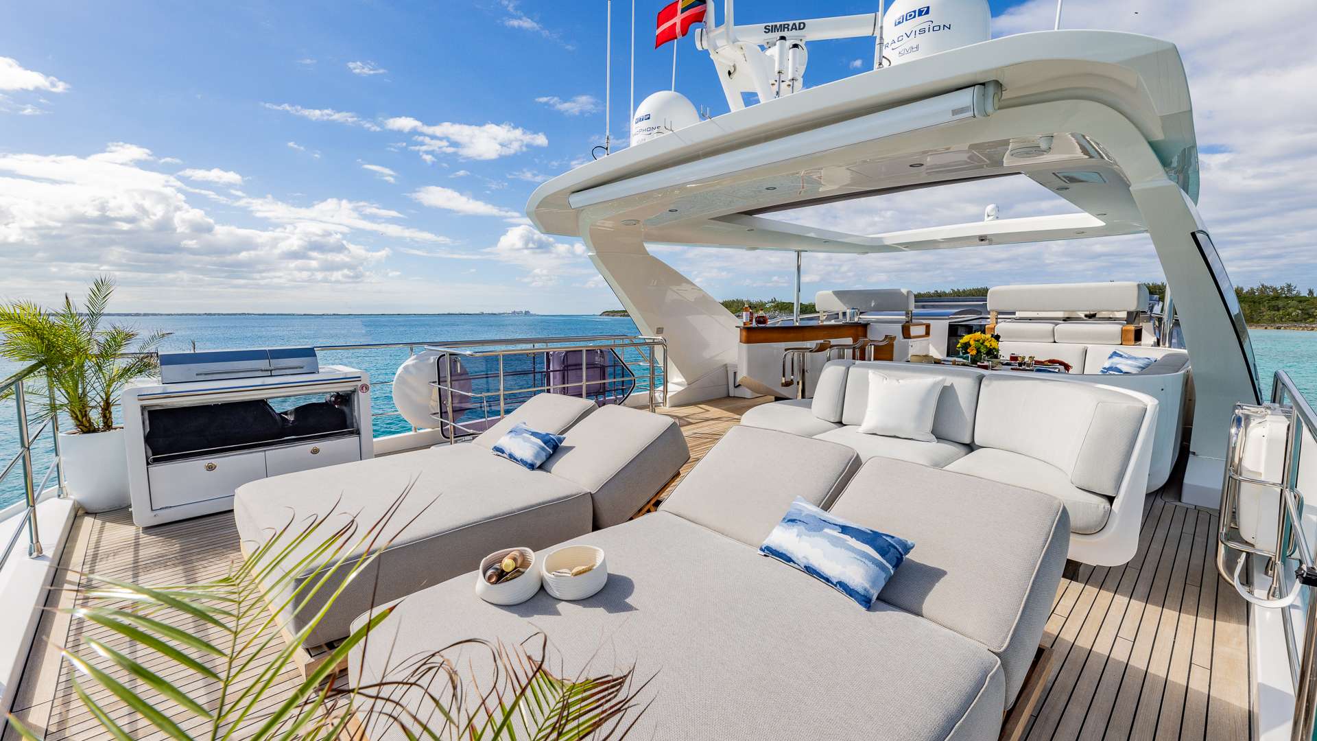 Outdoor living is paramount. The aft deck frames sunset cocktails and dining, whilst the flybridge commands panoramic views of Shroud Cay and neighbouring anchorages. A generous foredeck lounge suits morning coffee, and full-service bar and sun pads invite unhurried relaxation. Each cabin is ensuite, with the master featuring a sweeping glass window to wake to ocean vistas.