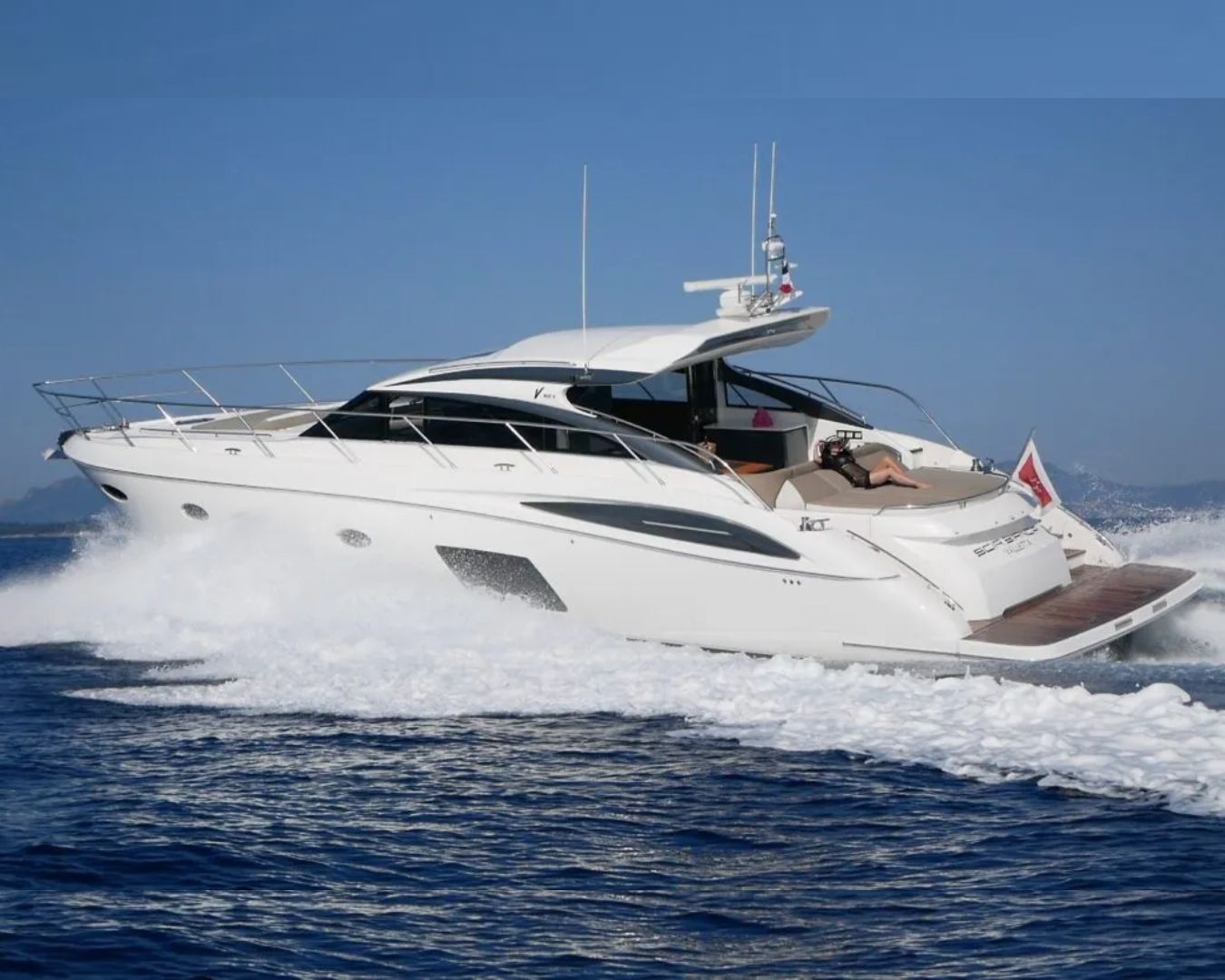 Charter the Princess V62S from Juan-les-Pins, Cannes, or Antibes and cruise at purposeful speed between the Riviera's most coveted anchorages. Your welcome includes champagne, soft drinks, fresh towels, and snorkeling gear. Charter hours run 9:30 am to 7:00 pm; the fee covers VAT and captain's service, though provisions, port fees, fuel, and additional water toys are billed separately. Gratuity is customary and entirely at your discretion.