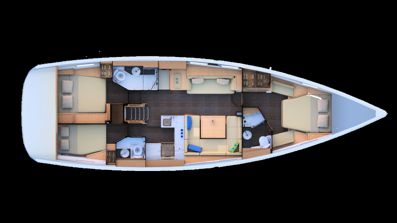 - •Three cabin, two head layout sleeps six across queen and double berths