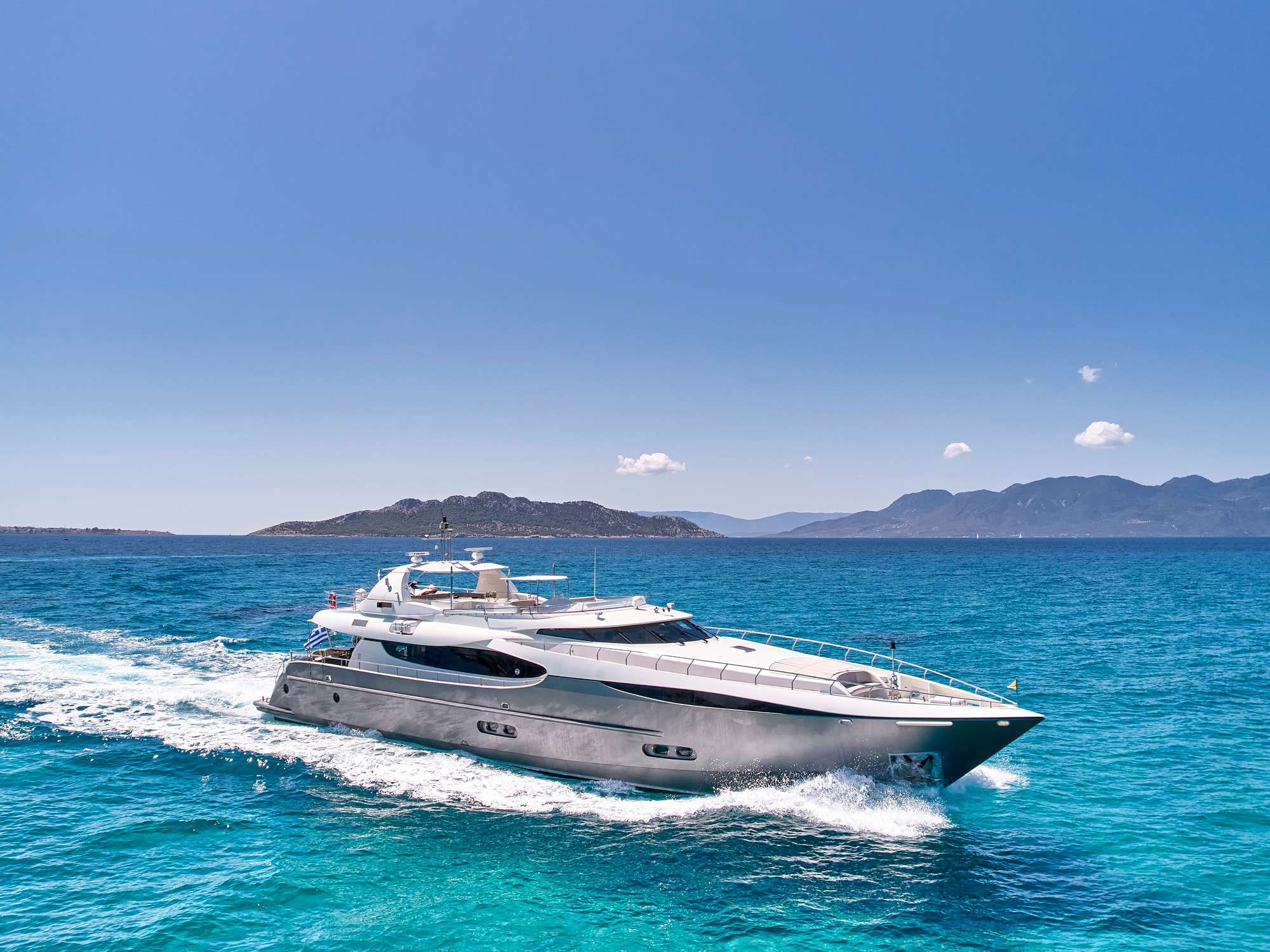 SANJANA is a Leight Notika Centaurian 108 that commands attention through understated refinement. Her streamlined profile belies a carefully considered interior where contemporary Turkish styling and teak detailing create spaces designed for both intimate moments and convivial gatherings. Natural light floods the main saloon through oversized windows, while four double cabins below deck offer private sanctuaries with en-suite facilities. This is a yacht built for genuine comfort, not mere showiness.